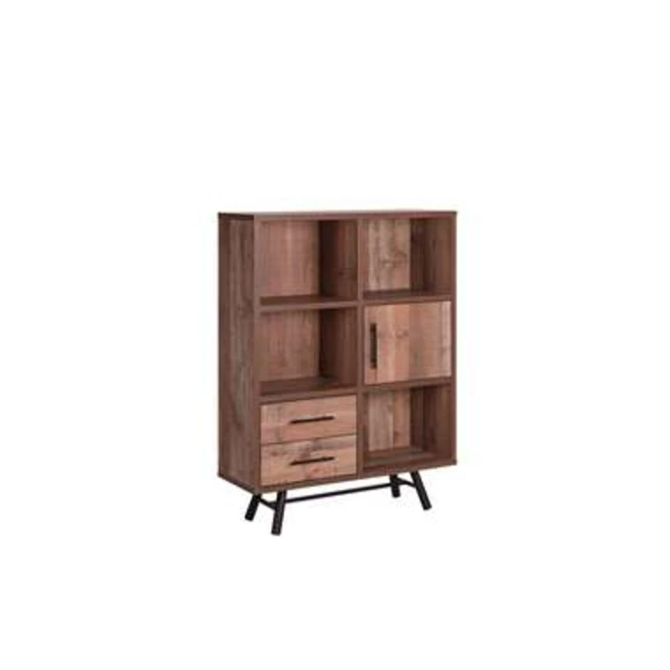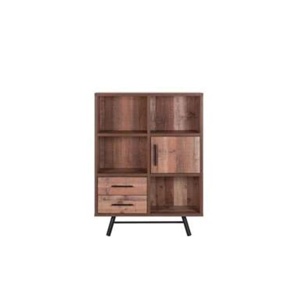 Rustieke wandkast met vakken en lades. Organiseer je woonkamer opnieuw met deze ruime wandkast met de rustieke charme van het wilde westen. Het biedt een verscheidenheid aan opslag mogelijkheden: vier open vakken, twee ruime laden en een door een deur afgesloten vak. Hierdoor geeft de kast genoeg ruimte voor je collectie boeken, gezin-items en vele decoratieve objecten. Het designmeubel staat op vier stevige metalen poten.