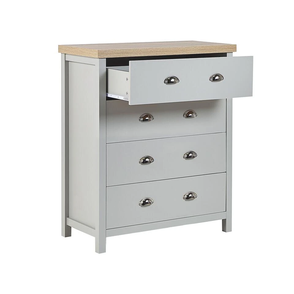 Praktische ladekast in grijs met een plank in een lichte houtkleur. Dit klassieke, stijlvolle, zacht grijze dressoir met licht houten bovenblad brengt extra sfeer in jouw interieur. Het combineert op smaakvolle wijze gebruik van hoogwaardige materialen met een universele uitstraling. Daarbij is het dressoir zeker niet eentonig dankzij het bovenblad in de lichte houtkleur welke prachtig contrasteert met het overige zachte grijs. Het dressoir heeft veel opbergruimte, twee lades en twee royale schappen die zich achter openslaande deuren bevinden.