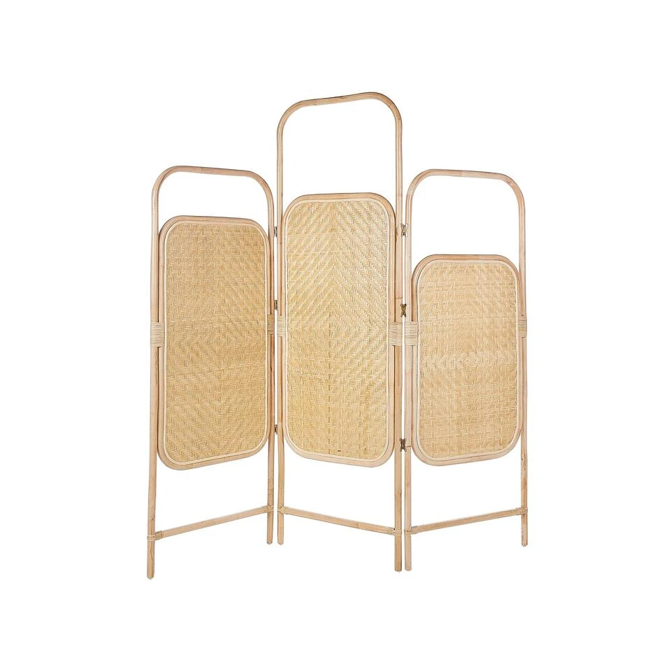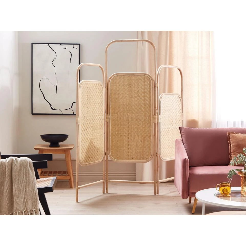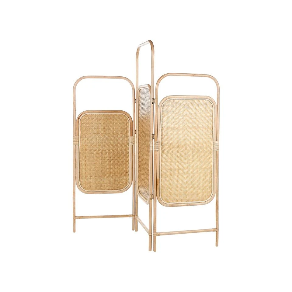 Decoratief kamerscherm . Transformeer je leefruimte met de toevoeging van dit prachtige decoratieve kamerscherm met 3 panelen. Het is zorgvuldig gemaakt met een rotan frame en bamboe houten details en heeft afgeronde organische randen voor een vleugje elegantie. Dit kamerscherm is perfect voor Japandi esthetiek en combineert naadloos minimalistische eenvoud met de uitnodigende warmte van natuurlijke materialen. Creëer een stijlvolle en veelzijdige afscheiding die perfect past bij je interieur met dit prachtige rotan kamerscherm.