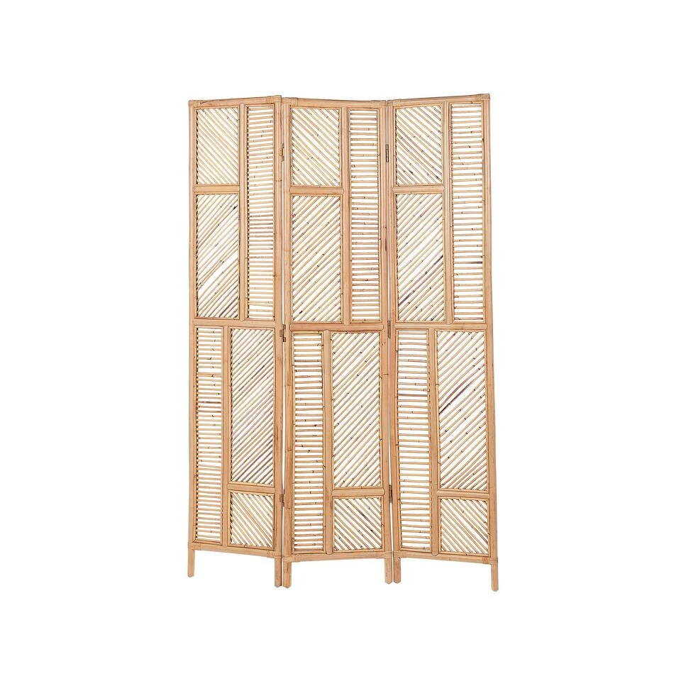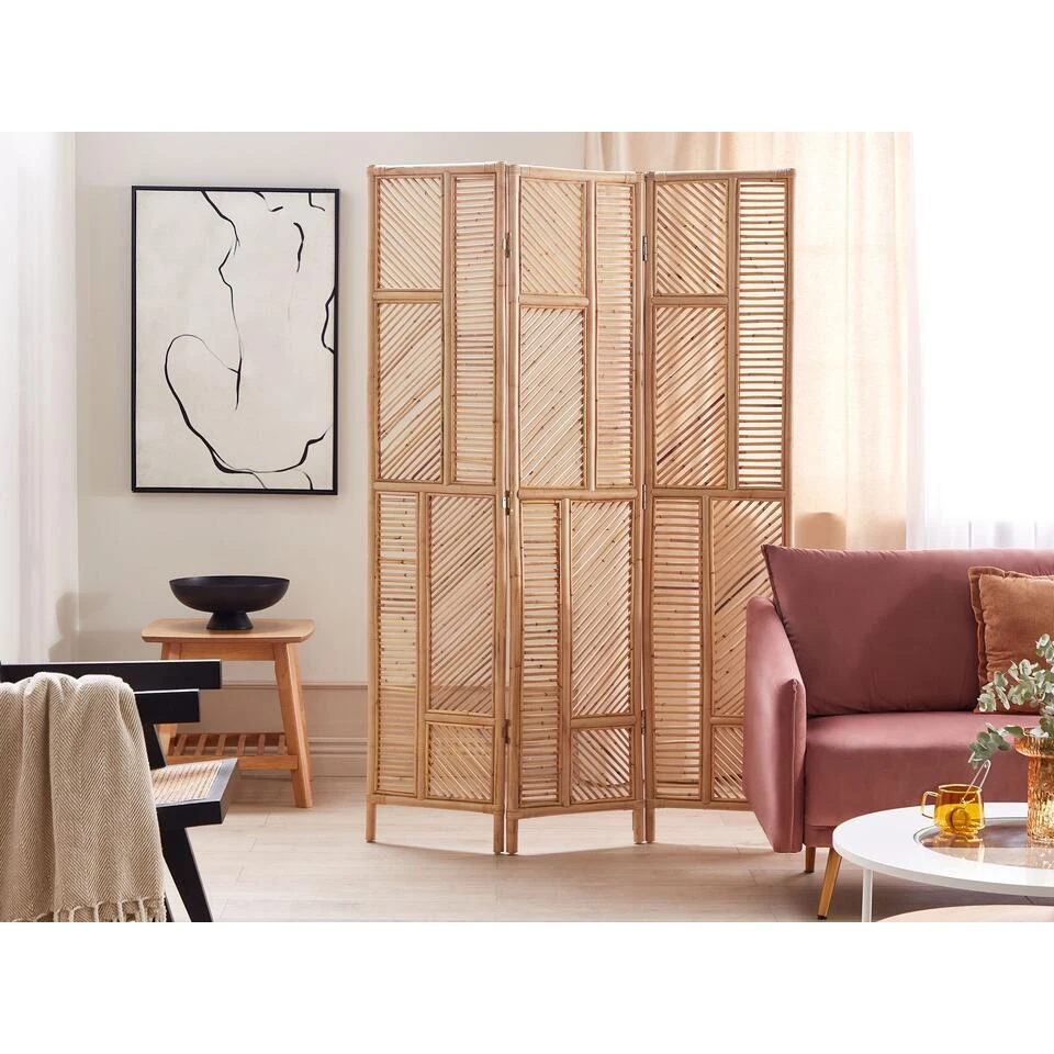 Decoratieve roomdivider. Upgrade je ruimte met deze kamerscherm met drie panelen. Dit opvouwbare pareltje bespaart niet alleen ruimte, maar is ook een echte eyecatcher voor je huis. Het scherm fungeert als een verplaatsbare muur, waardoor je je ruimte in een handomdraai kunt transformeren. Gemaakt van lichtkleurig rotan met een decoratief geometrisch patroon, is het een moderne toevoeging die perfect past bij Boho, minimalistische of Japandi interieurs.