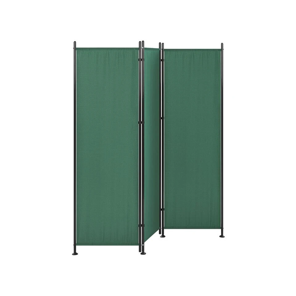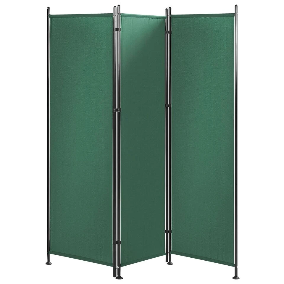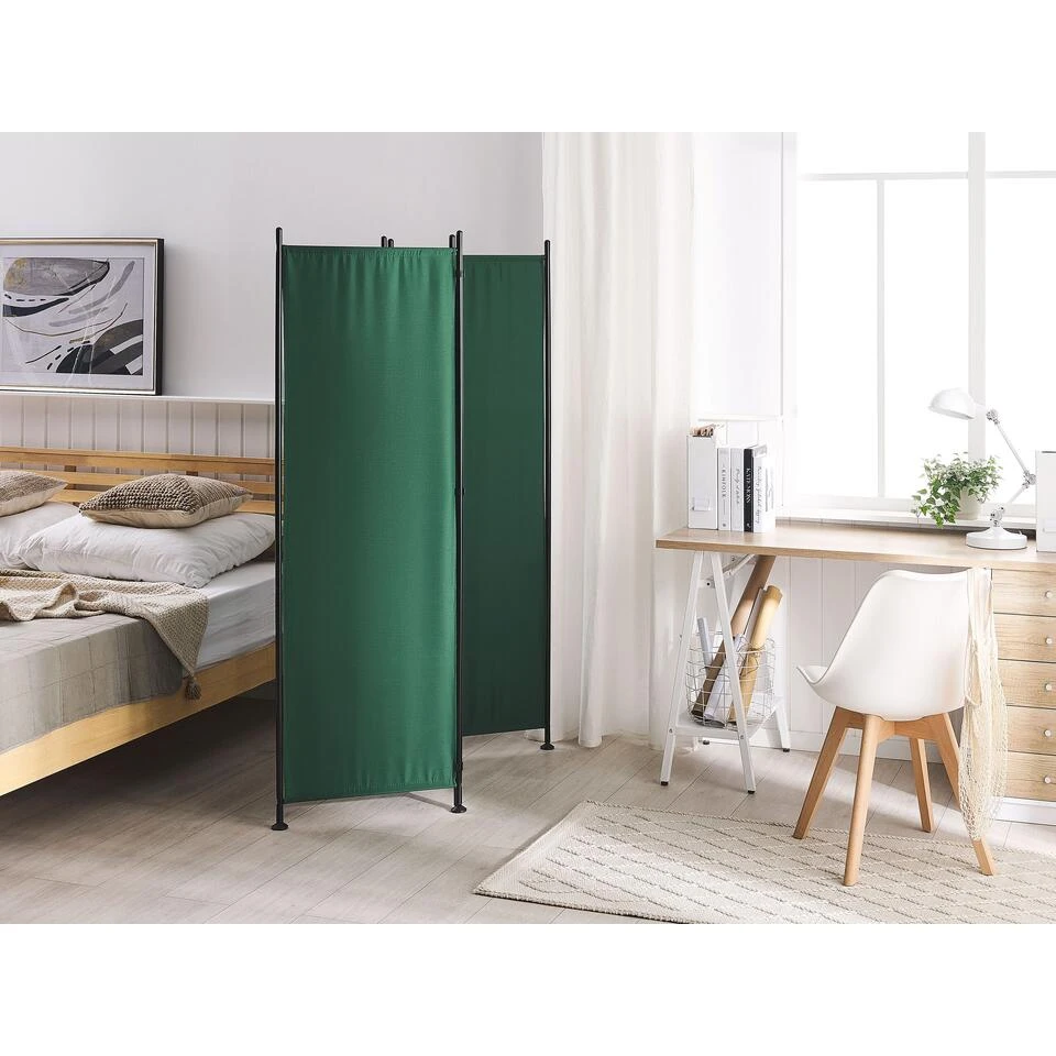 Polyester kamerscherm in groen . Plaats dit kamerscherm in jouw slaapkamer of andere binnenruimtes om ze meer privé en stijlvol te maken. Dit kamerscherm is gemaakt van gemakkelijk te onderhouden polyester, terwijl het frame is gemaakt van staal, wat de duurzaamheid van het hele stuk garandeert. Door zijn constructie van drie panelen, kan het dit kamerscherm gemakkelijk worden opgevouwen en verborgen wanneer het niet nodig is. Door de moderne kleur past de room divider in allerlei verschillende interieurstijlen.
