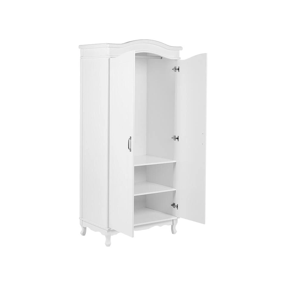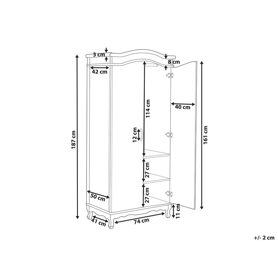 Kleerkast met kledingstang. Organiseer je kleding in een stijlvol meubelstuk dat de inrichting van je slaapkamer of woonkamer intact laat. De 2-deurs kast is voorzien van metalen handgrepen en Frans geïnspireerde decoratieve elementen met delicaat, sierlijk houtsnijwerk dat een elegante uitstraling geeft.