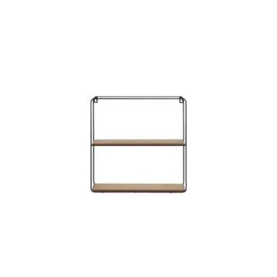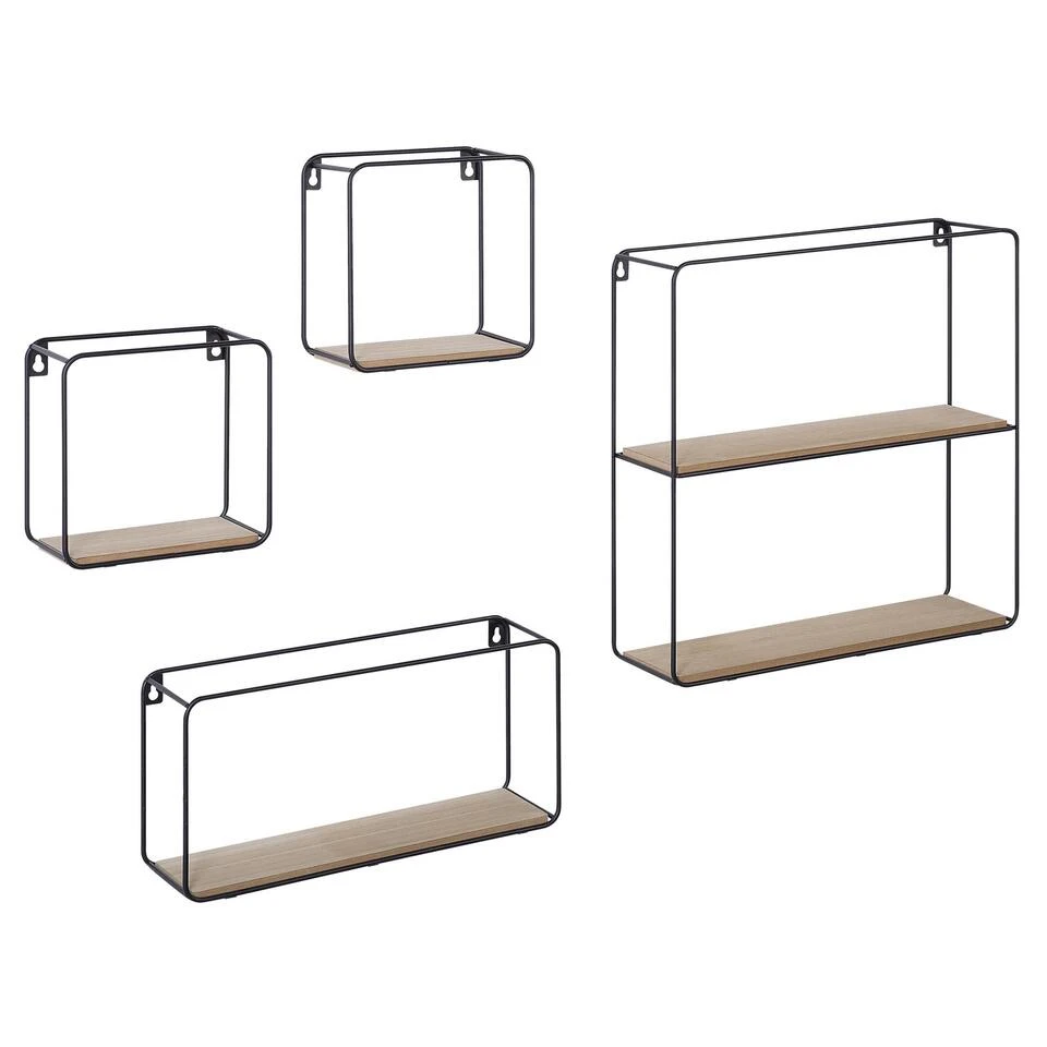 Minimalistische wandplank set. Deze praktische, vierkante wandplank set bestaande uit vier afzonderlijke delen, is de ideale opbergmogelijkheid voor elk appartement. De materiaalmix van metaal en hout en de klassieke kleurencombinatie van zwart en lichtbruin maakt de set tot een stijlvolle toevoeging aan jouw huis. Allerlei kleine dingen en decoratieve elementen kunnen hier worden gepresenteerd en opgesteld.