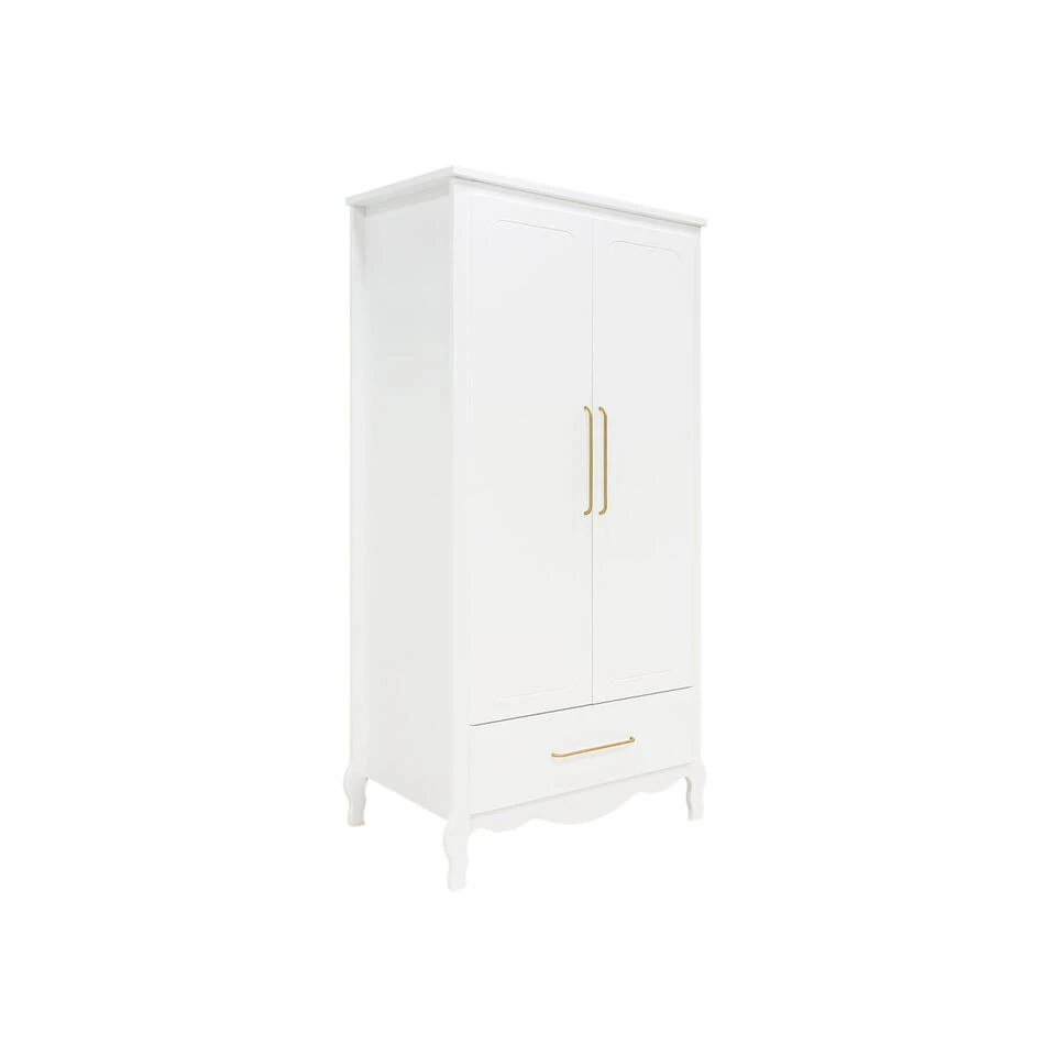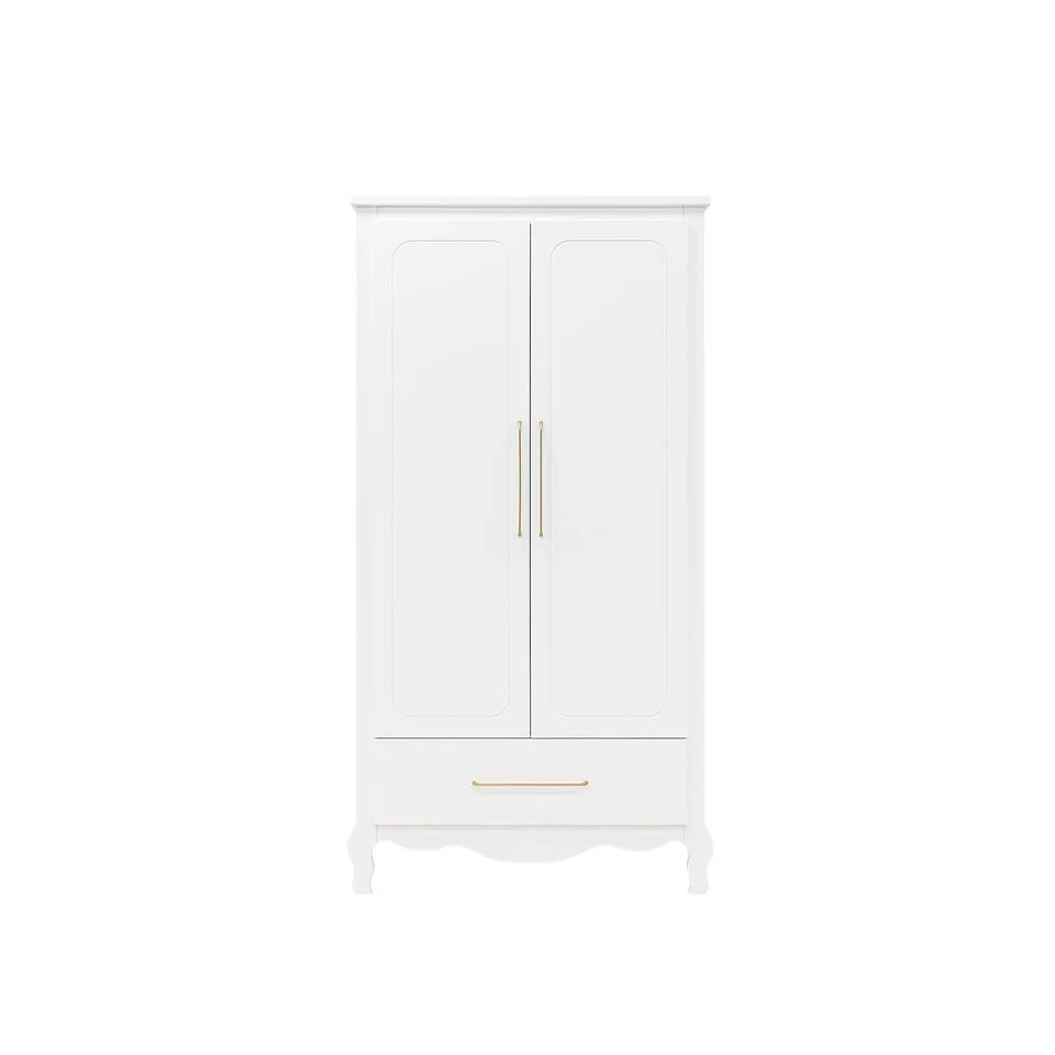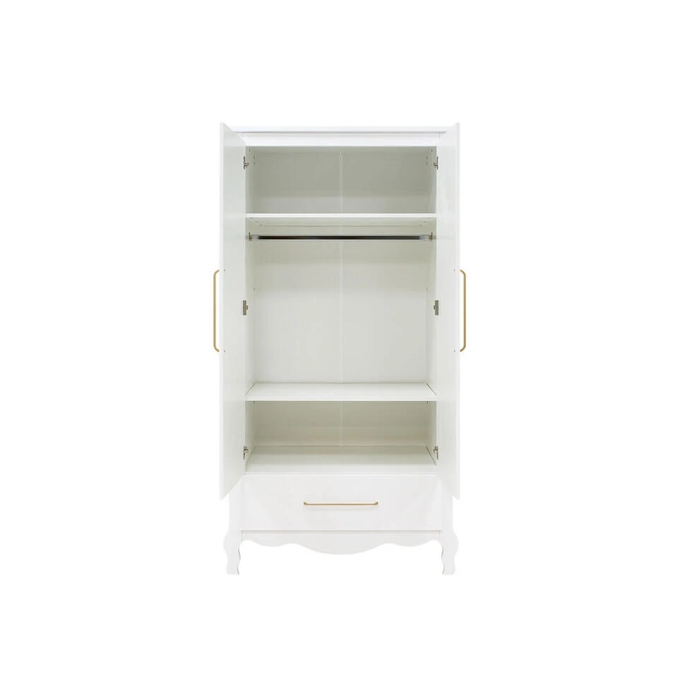 Deze grote kledingkast Elena van Bopita heeft een romantische uitstraling door de sierlijke vormen en goudkleurige accenten. De deuren zijn vervaardigd van solide MDF en zijn voorzien van uitgefreesde, afgeronde groeven. De elegante handgrepen op de deuren en lade zijn goudkleurig, mat afgewerkt. De deuren en lade zijn voorzien van een softclose mechanisme, waardoor deze zachtjes sluiten. De gehele kast is vervaardigd van robuust MDF en is dekkend wit gelakt. De lakken waarmee deze garderobekast is afgewerkt zijn op waterbasis. Dit is niet alleen veilig voor kinderen, maar ook milieuvriendelijk. Het hout van deze kast is afkomstig uit Europese bossen. Het interieur bestaat uit een vaste legplank, een in hoogte verstelbare legplank en een hangroede. In combinatie met de lade heb je heel veel opbergruimte! Combineer deze kast Elena met de andere meubels van dezelfde serie, en creëer een romantische baby- of kinderkamer.