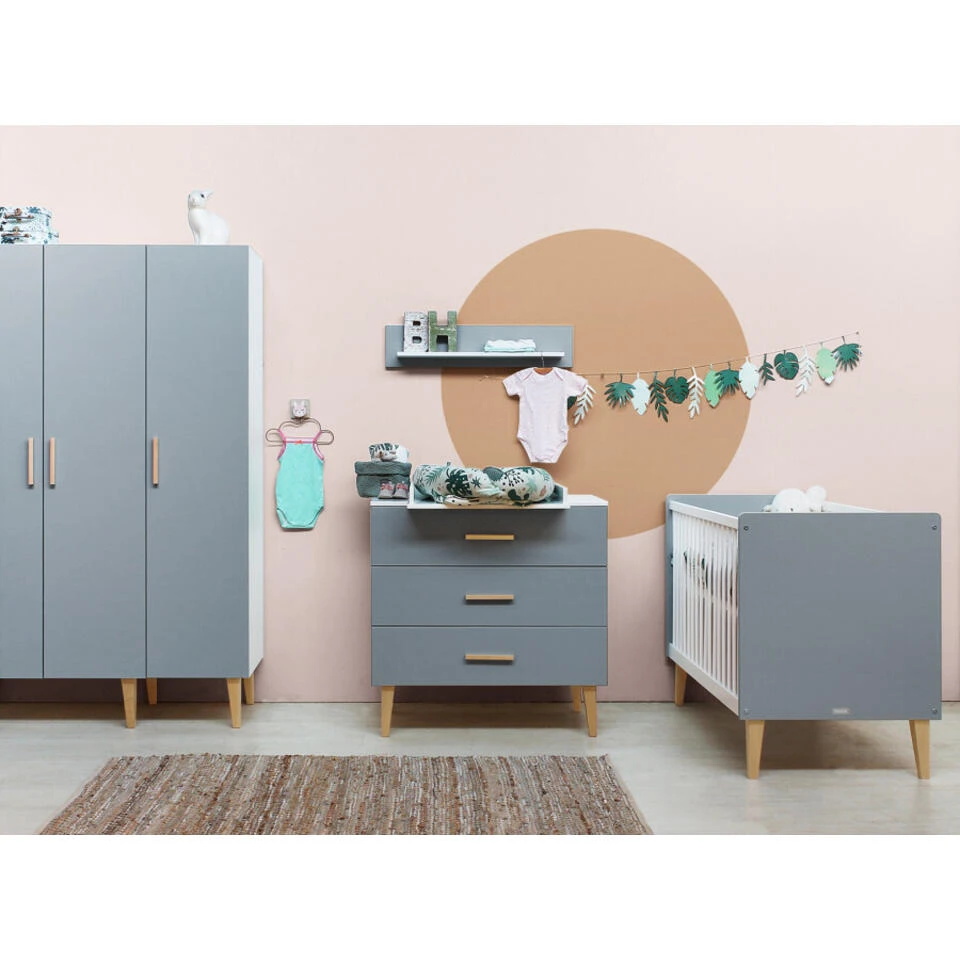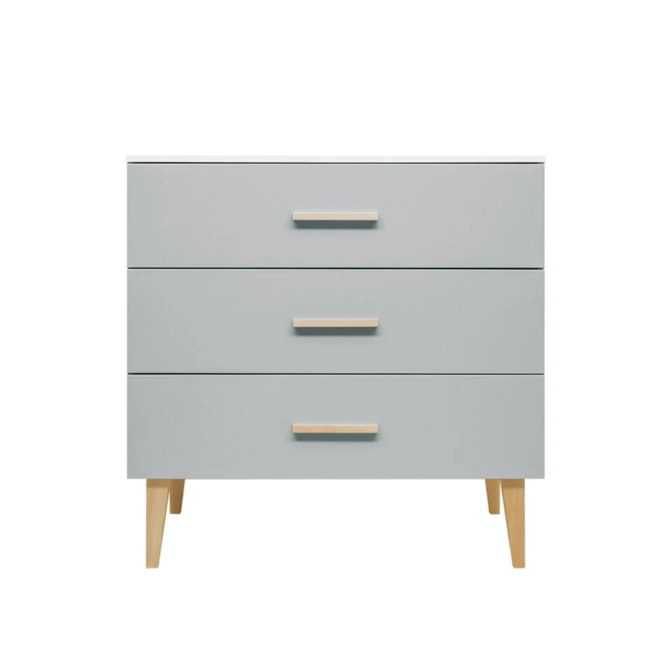 Commode uit de serie Emma met 3 laden. De commode staat op ranke beuken pootjes. De laden zijn voorzien van een grijs front en eveneens beuken handgrepen. Te combineren met de barrier Uno en het wandrek van de serie Emma.