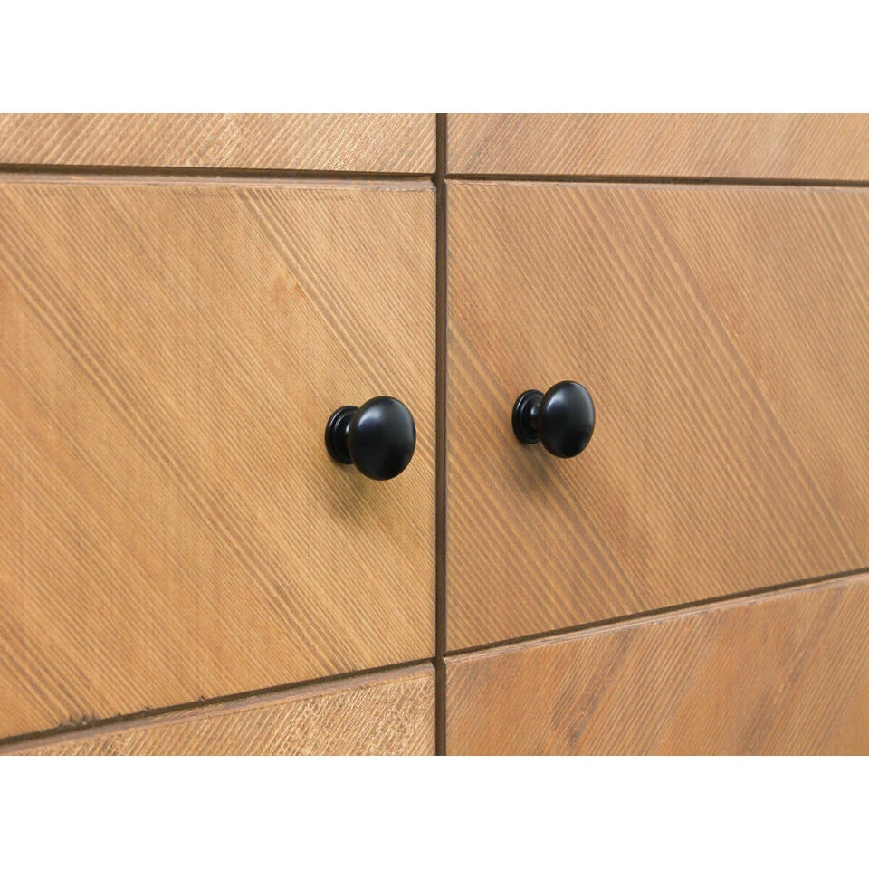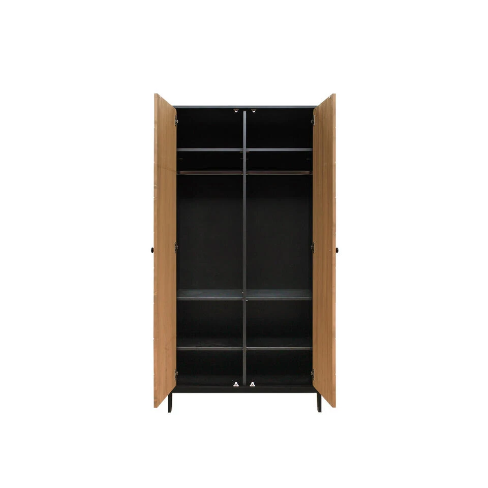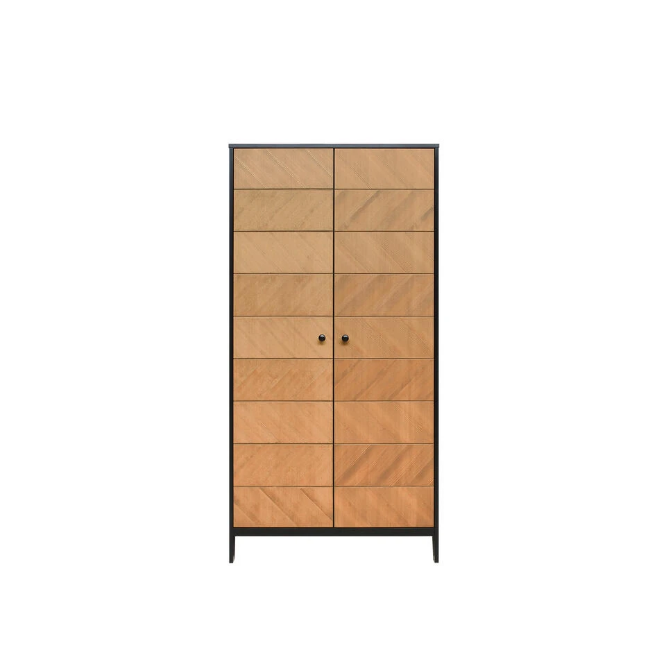 Deze stijlvolle kledingkast Job van Bopita is uitgevoerd in een stoere combinatie van mat zwart en gefineerd hout. De deuren zijn voorzien van een visgraatmotief en hebben een ronde knop als handgreep. Aangezien het een natuurproduct betreft kan de houtstructuur per meubel van de serie Job verschillen. Door de softclose sluiting vallen de deuren zachtjes dicht. De gebruikte lak is op waterbasis, en daardoor veilig voor kinderen en milieuvriendelijk. Het hout van deze kast is afkomstig uit Europese bossen. Het interieur van deze garderobekast bestaat uit twee compartimenten en bevat zes in hoogte verstelbare legplanken en twee in hoogte verstelbare hangroedes. Je kan deze kast dus naar eigen wens indelen.