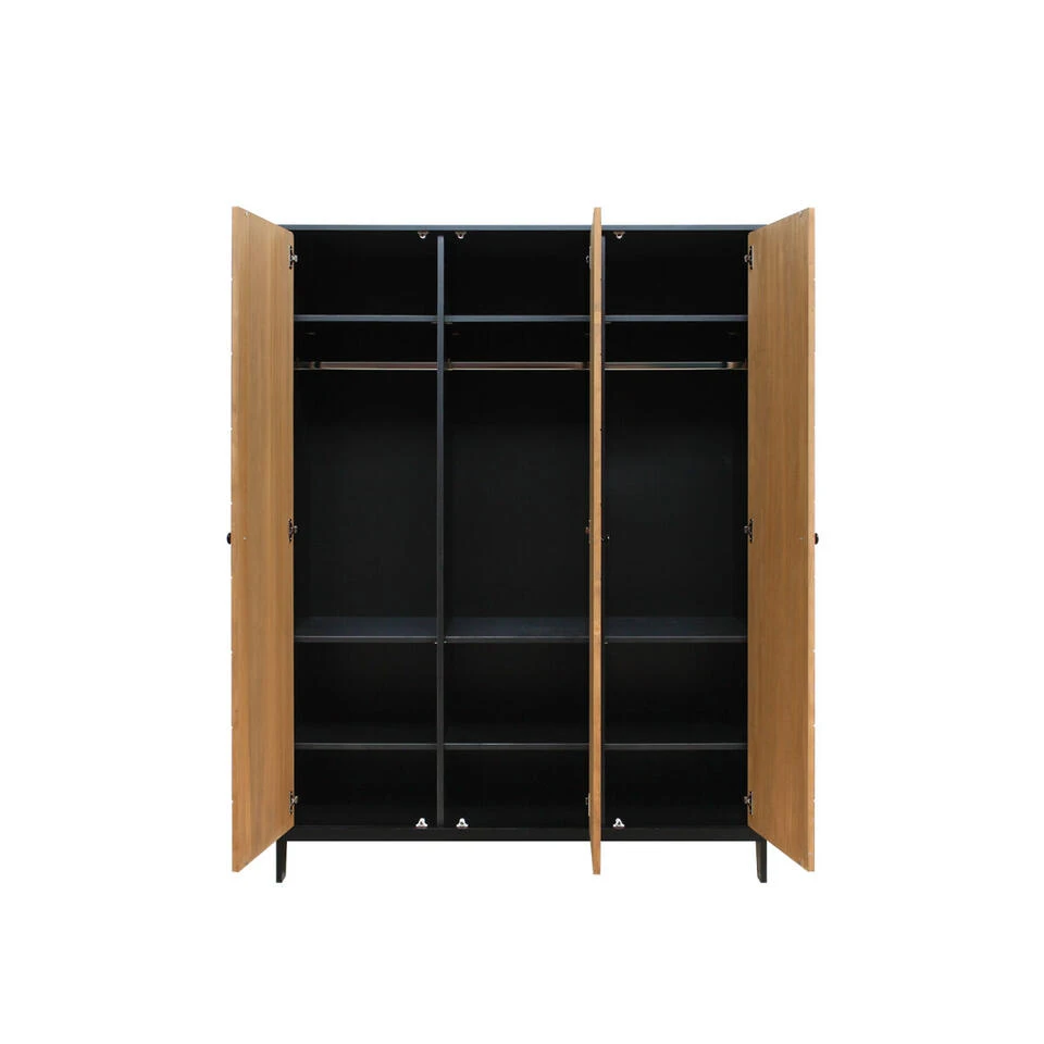 Deze stijlvolle kledingkast Job van Bopita is uitgevoerd in een stoere combinatie van mat zwart en gefineerd hout. De deuren zijn voorzien van een visgraatmotief en hebben een ronde knop als handgreep. Aangezien het een natuurproduct betreft kan de houtstructuur per meubel van de serie Job verschillen. Door de softclose sluiting vallen de deuren zachtjes dicht. De gebruikte lak is op waterbasis, en daardoor veilig voor kinderen en milieuvriendelijk. Het hout van deze kast is afkomstig uit Europese bossen. Het interieur van deze garderobekast bestaat uit drie compartimenten en bevat maar liefst negen in hoogte verstelbare legplanken en drie in hoogte verstelbare hangroedes. Het is dus mogelijk om deze kast naar eigen wens in te delen.