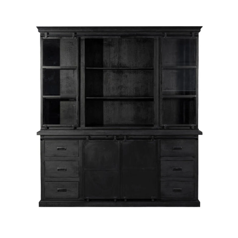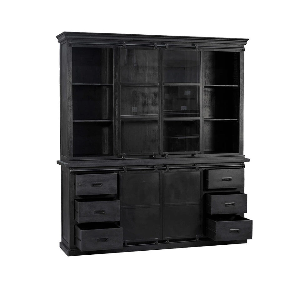 Het bovenste deel van deze buffetkast geeft je de mogelijkheid om je servies of andere decoratieve voorwerpen prachtig weer te geven. Met de twee glazen schuifdeuren kan je zelf kiezen welk deel je afschermt. Het onderste deel is voorzien van twee zwarte stalen schuifdeuren en zes lades en geeft je de mogelijkheid om voorwerpen te verbergen die niet iedereen hoeft te zien.