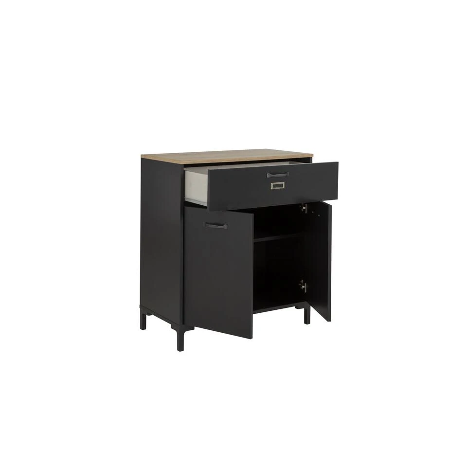 De buffetkast heeft een grote opberglade aan de bovenkant, ideaal voor het opbergen van bestek, tafelkleden en andere keukenaccessoires. De twee deuren aan de onderkant verbergen een in hoogte verstelbare plank, waardoor potten, pannen en andere keukengerei gemakkelijk kunnen worden opgeborgen.