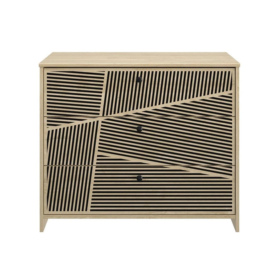 Het claustra-motief dat in zwart op de 3 zijden van de laden is gedrukt, geeft deze commode een originele en trendy uitstraling. De zwarte gelakte metalen knoppen voegen een vleugje verfijning toe aan het geheel.