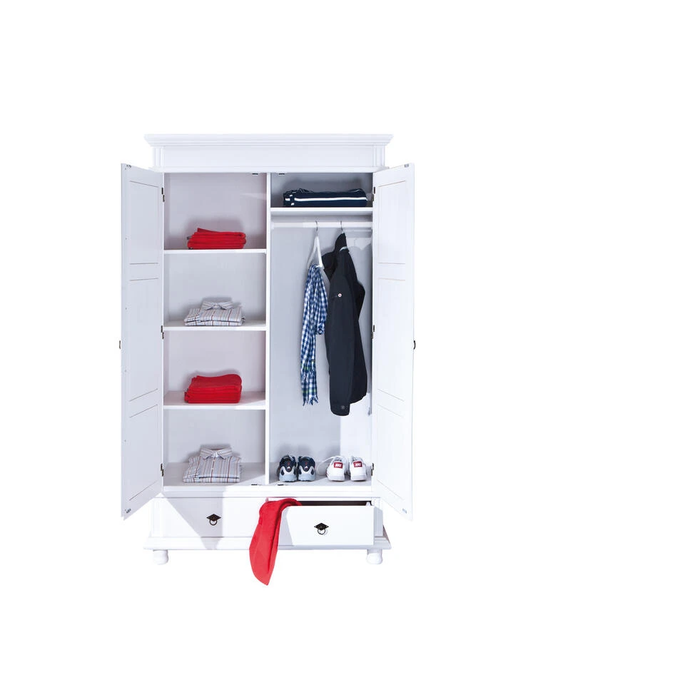 Massief wit grenen tweedeurskledingkast met 2 schuiflades. Een stabiele en stevige kledingkast voor in uw slaapkamer! De kledingkast Danz past zeer goed bij de wit gelakte tienerbedden uit ons assortiment.