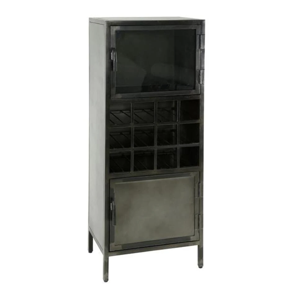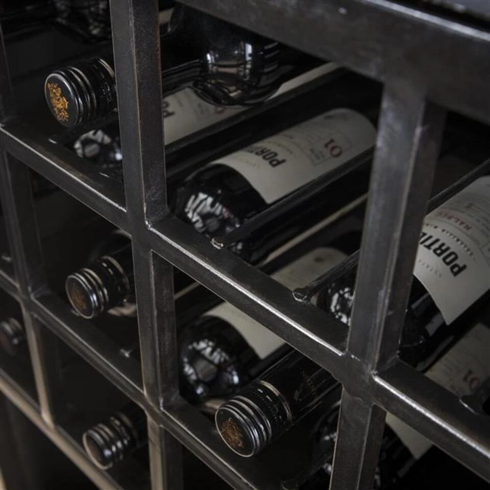 De wijnkast is gemaakt van metaal wat vintage afgewerkt is. De zwarte kleur is dus niet geheel egaal. Elke kast is dan ook erg uniek. Hierdoor komt de industriële look mooi naar voren en is dit de perfecte combinatie met het glas.