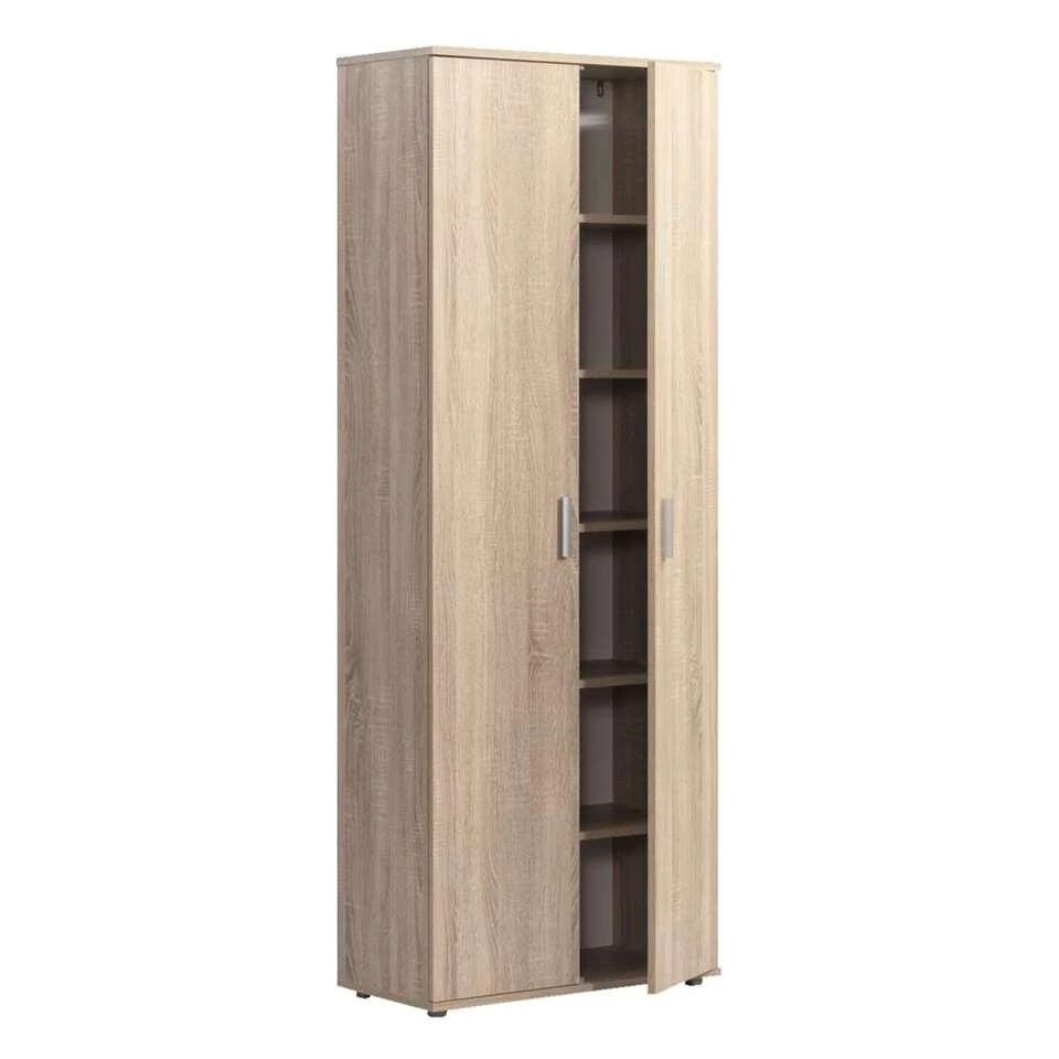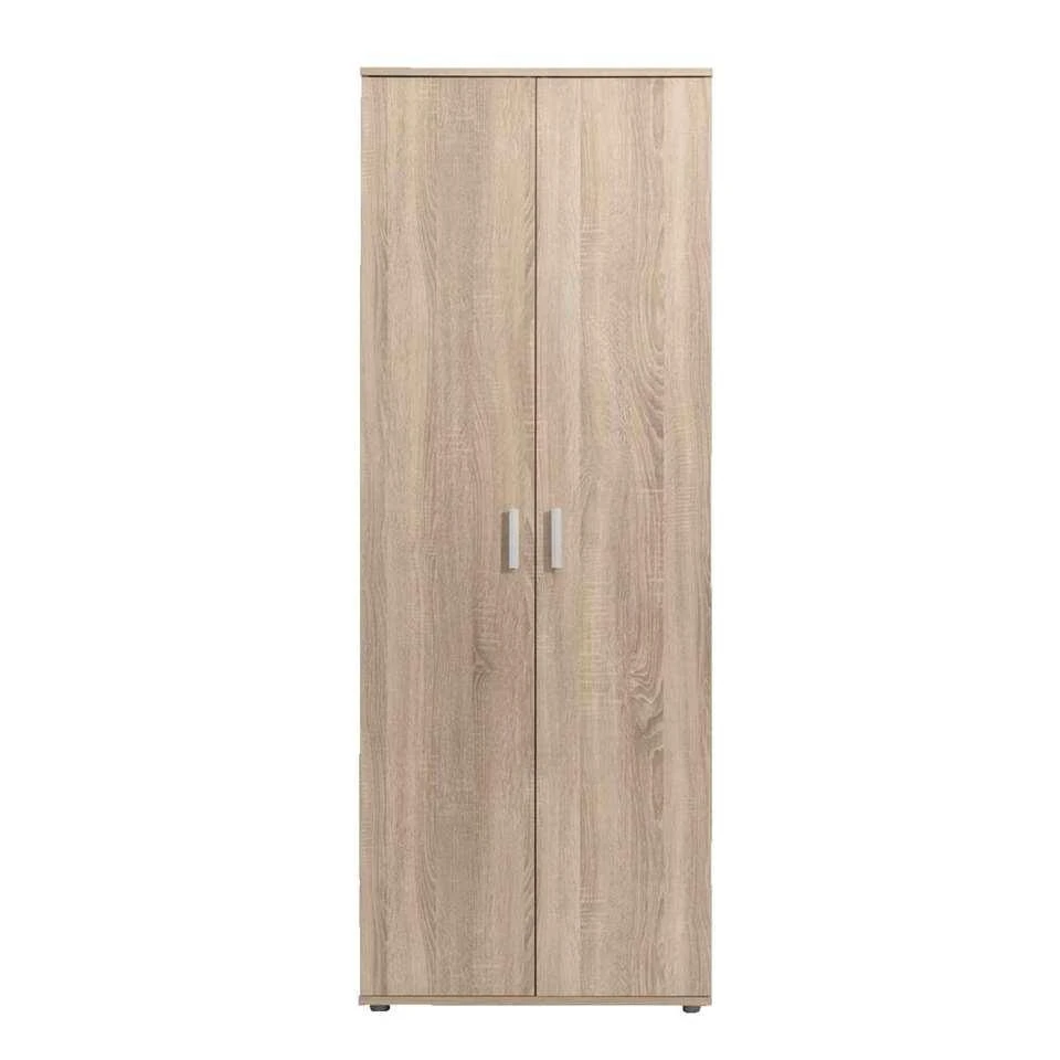 Kast Inca 2-deurs is een praktische en compacte kast met ruime opbergmogelijkheden. De 2-deurs kast is uitgevoerd in eikenkleur en heeft legplanken. De deur is voorzien van zilverkleurige handvatten. De kledingkast heeft een totale afmeting van 184x70x34,5 cm.
