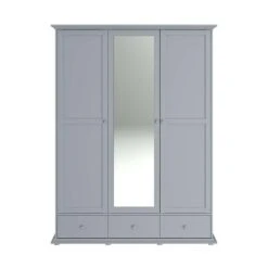 Kledingkast Margaux wordt gekenmerkt door een tijdloze elegantie. De kast is gemaakt van spaanplaat en heeft 3 deuren en 3 lades met metalen geleiders. De middelste deur is voorzien van een speigel. Achter de twee deuren vind je een kledingroede en een plank en achter de derde deur vind je 3 legplanken. Voldoende ruimte dus voor al je kleding. Ondergoed, t-shirts en sokken berg je op in de ruime lades.