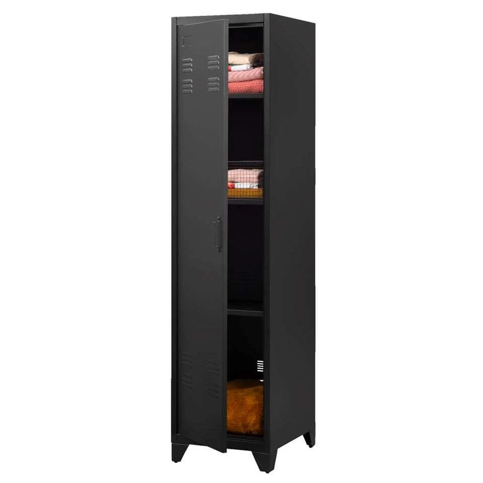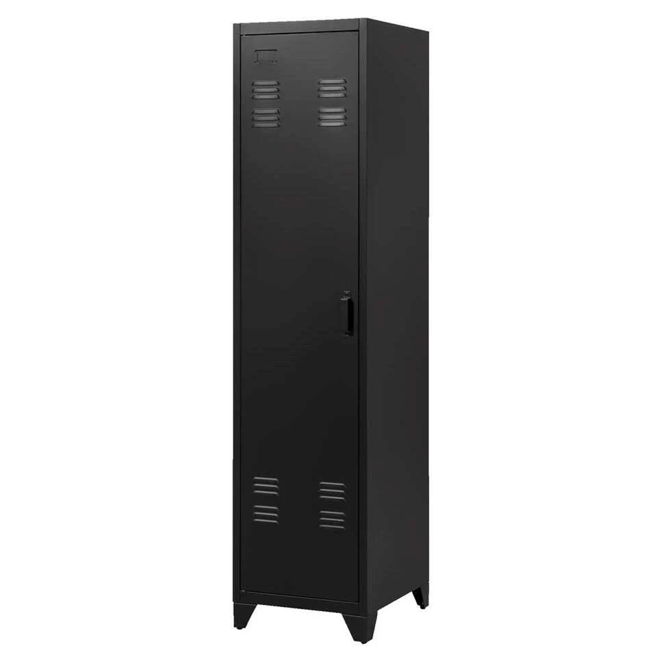 Lockerkast Mick is een stoere, metalen kledingkast met 3 extra legplanken. De afmeting is180x43x50 cm. Deze locker is ideaal voor een slaapkamer, maar is ook handig voor bijvoorbeeld een kantoorruimte om spulletjes in op te bergen. Combineer deze kast met het nachtkastje Mick voor een ultiem resultaat!