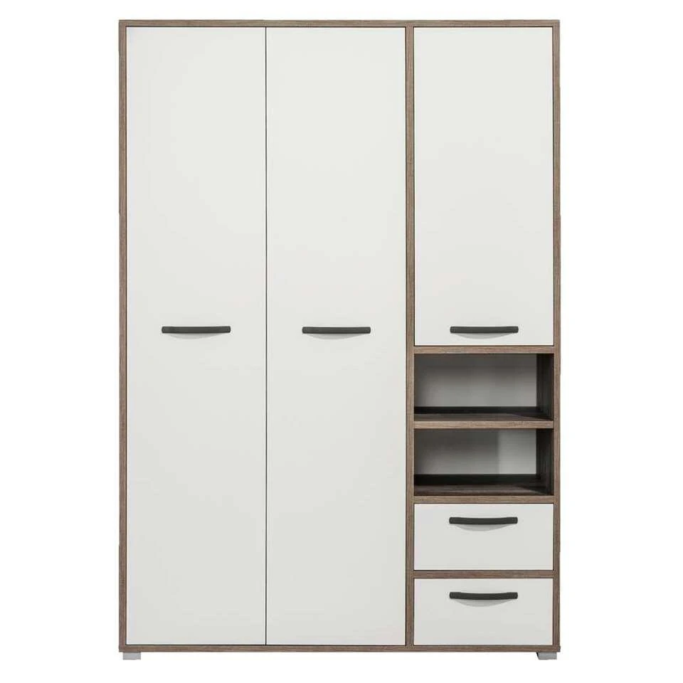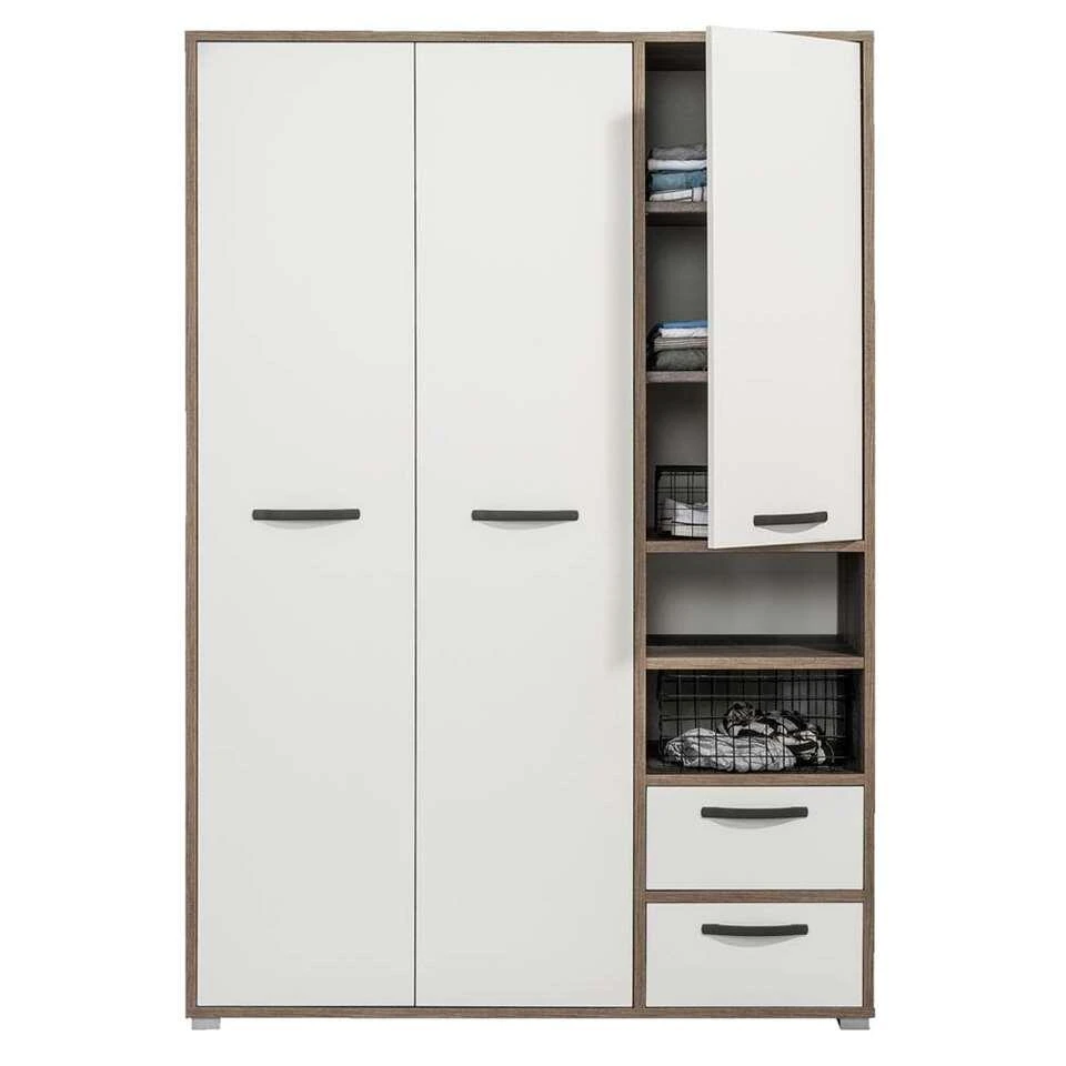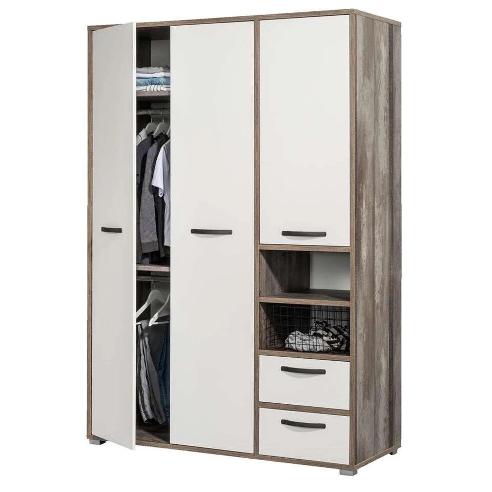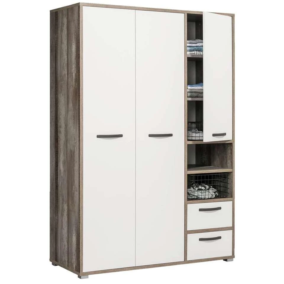 Kledingkast Mono 3-deurs is wit met steigerhoutlook en heeft een afmeting van 201x138x57 cm. Deze kast is gemaakt van spaanplaat. Deze kast heeft 3 deuren, 2 lades waar je bijvoorbeeld sokken en ondergoed in op kunt bergen en 2 open vakken. In de openvakken kun je bijvoorbeeld draadmandjes zetten met sjaaltjes, riemen of andere accessoires. De kast is zeer praktisch ingedeeld met legplanken en twee roedes om kleding aan op te hangen. Ruimte genoeg dus voor al je kleding, schoenen en accessoires.