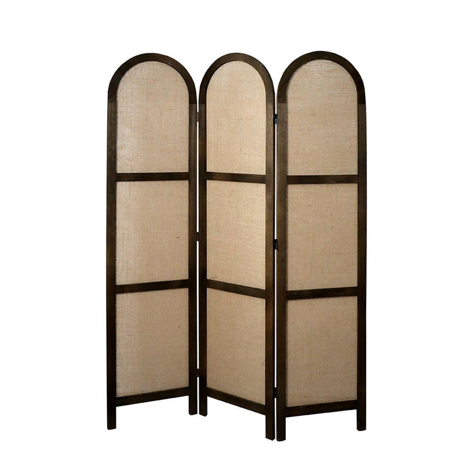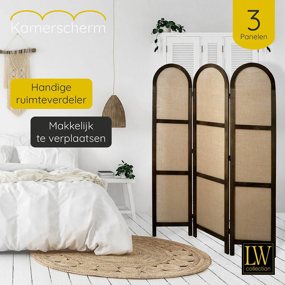 Dit decoratieve kamerscherm met 3 panelen in de kleur bruin heeft een afmeting van 170×120 cm (LxB) en past goed bij ieder interieur in huis of op uw werkplek. De mooie ronde bogen maken het kamerscherm uniek.Â