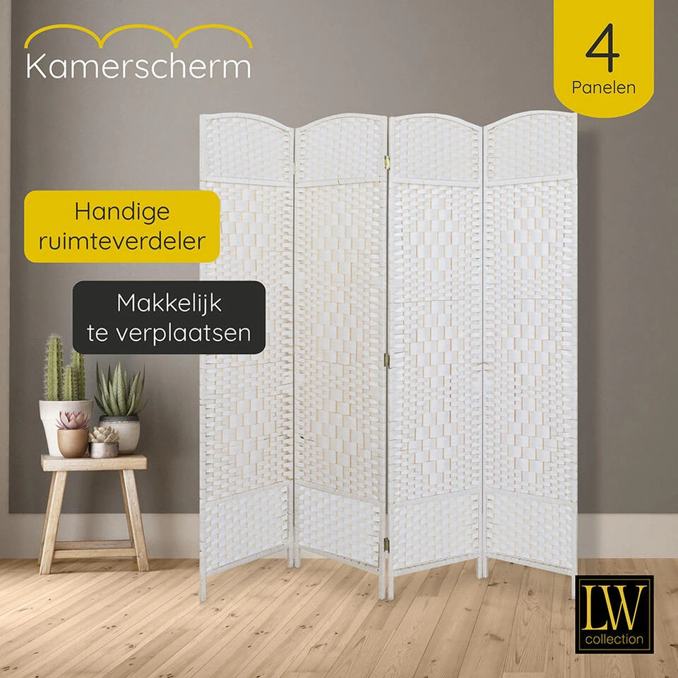 Scheidingswanden kunnen bijvoorbeeld ook gebruikt worden om een ruimte af te schermen. Ruimteverdelers worden ook wel gebruikt als decoratiestuk. LW Collection heeft een breed assortiment aan kamerschermen in uiteenlopende stijlen, materialen en kleuren. Kamerschermen of paravent van LW Collection worden gemaakt van hoogwaardige materialen om zo de hoogste kwaliteit te kunnen waarborgen.Â