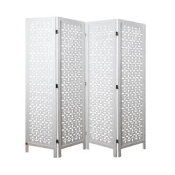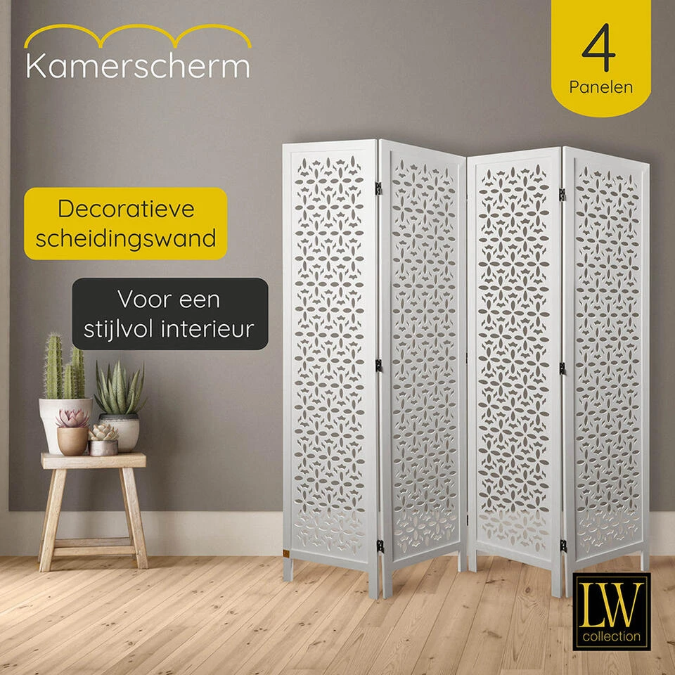 Dit decoratieve kamerscherm met 4 panelen van hout in de kleur wit heeft een afmeting van 170×160 cm en past goed bij ieder interieur in huis of op uw werkplek.