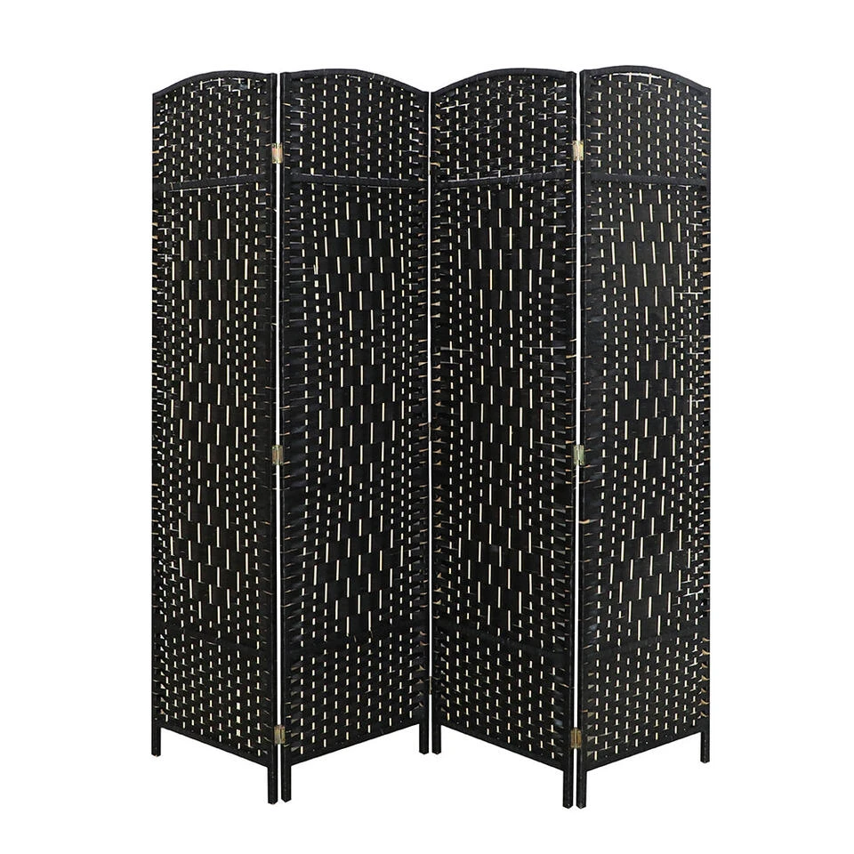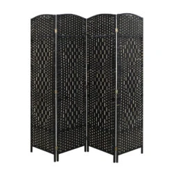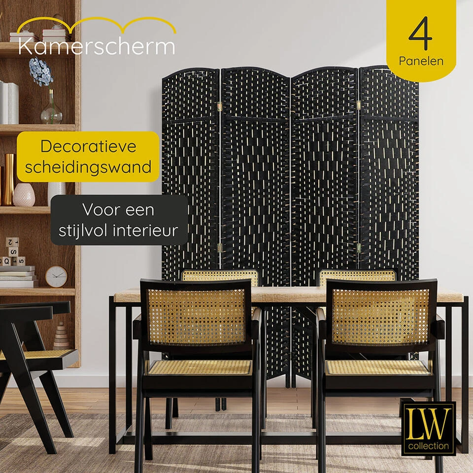 Dit decoratieve kamerscherm met 4 panelen van kunststof in de kleur zwart heeft een afmeting van 170×160 cm (LxB) en past goed bij ieder interieur in huis of op uw werkplek.