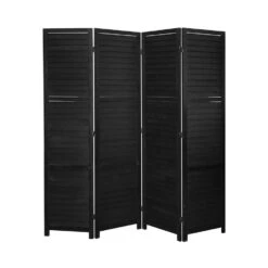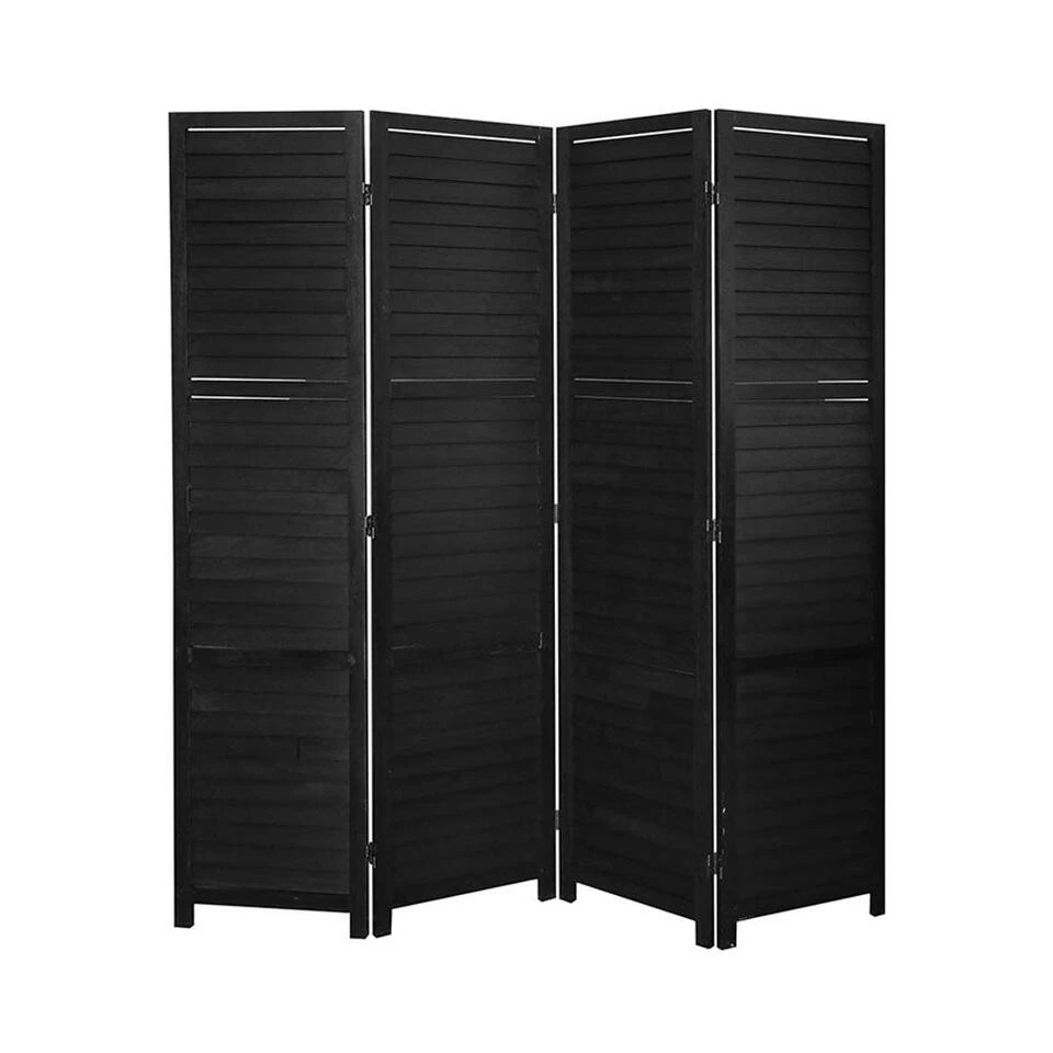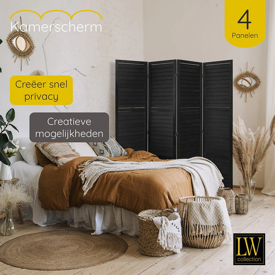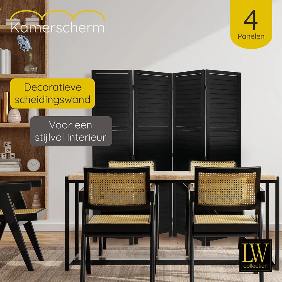 Dit decoratieve kamerscherm met 4 panelen van hout in de kleur zwart heeft een afmeting van 170×160 cm (LxB) en past goed bij ieder interieur in huis of op uw werkplek.