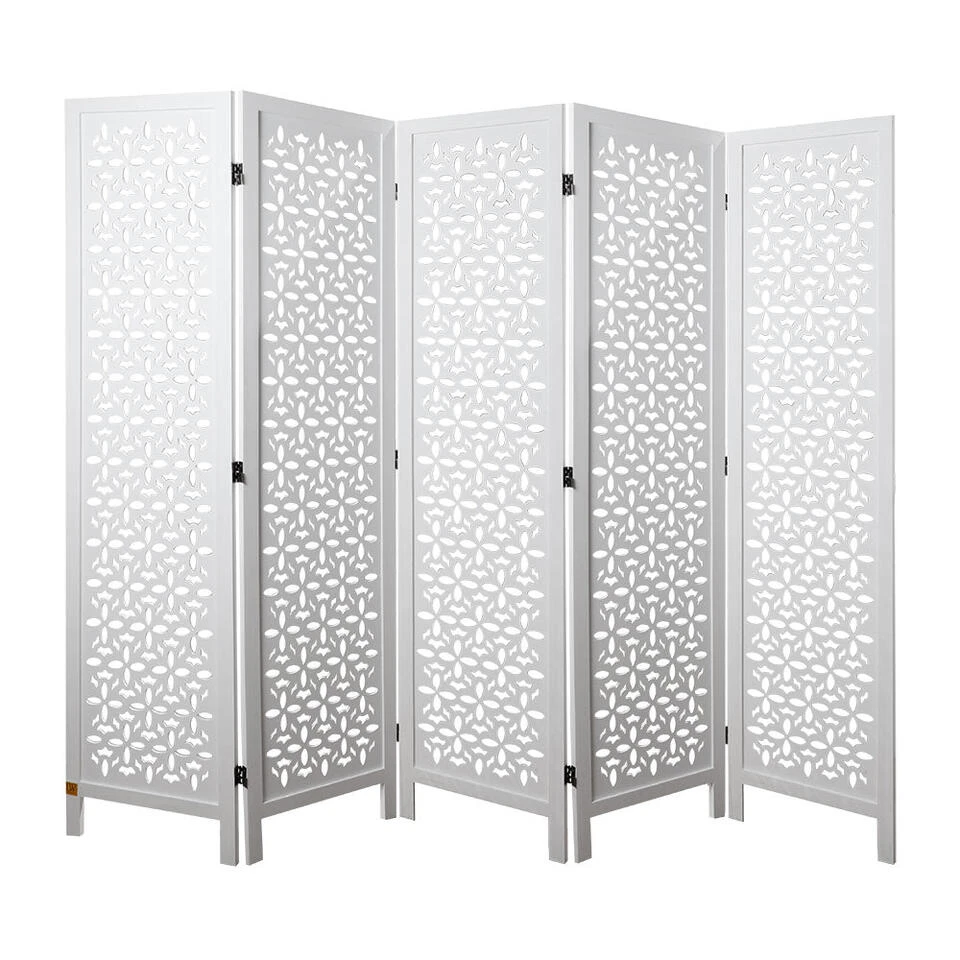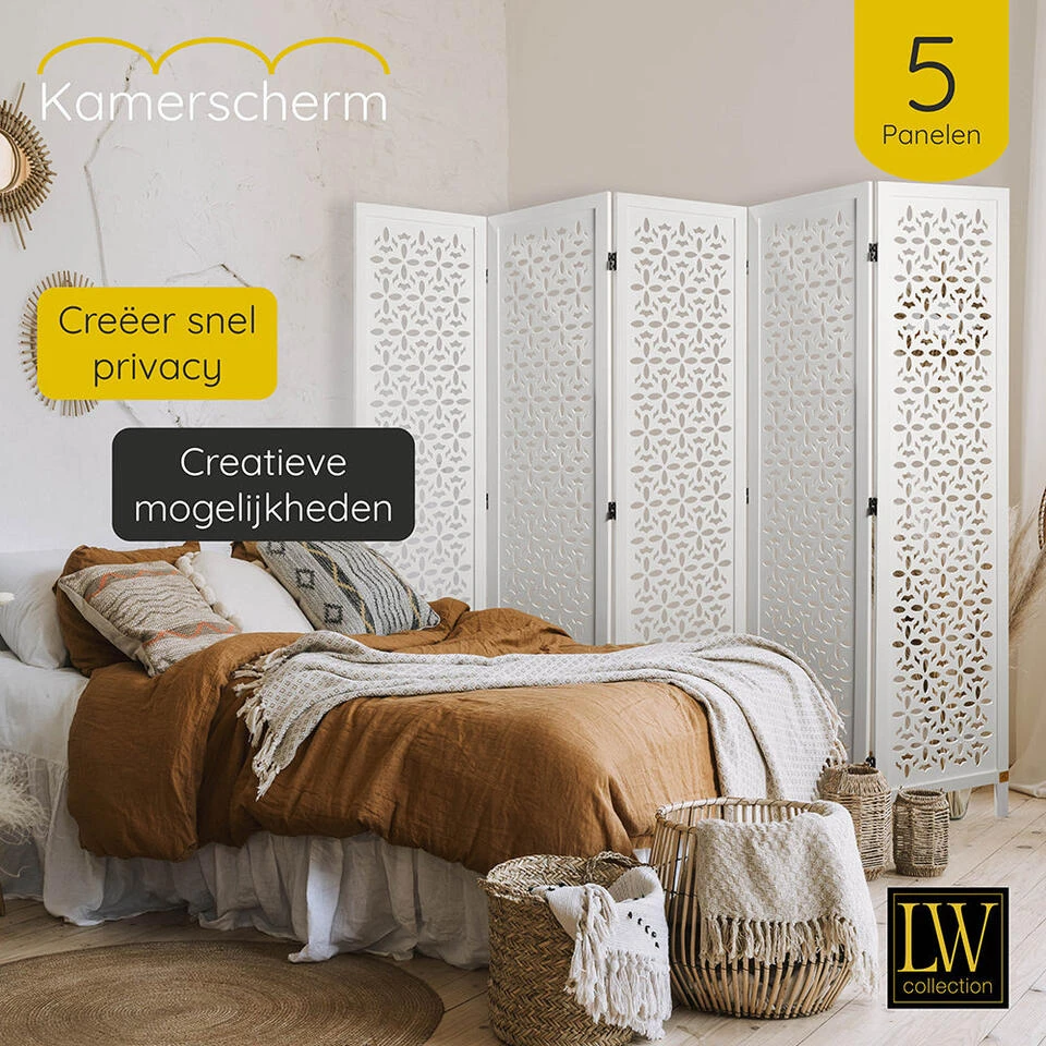 Dit decoratieve kamerscherm met 5 panelen van hout in de kleur wit heeft een afmeting van 170×200 cm en past goed bij ieder interieur in huis of op uw werkplek.