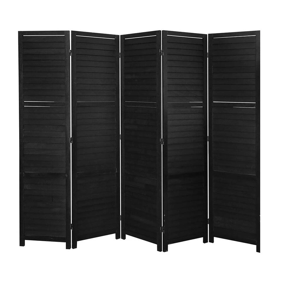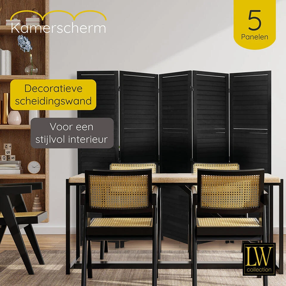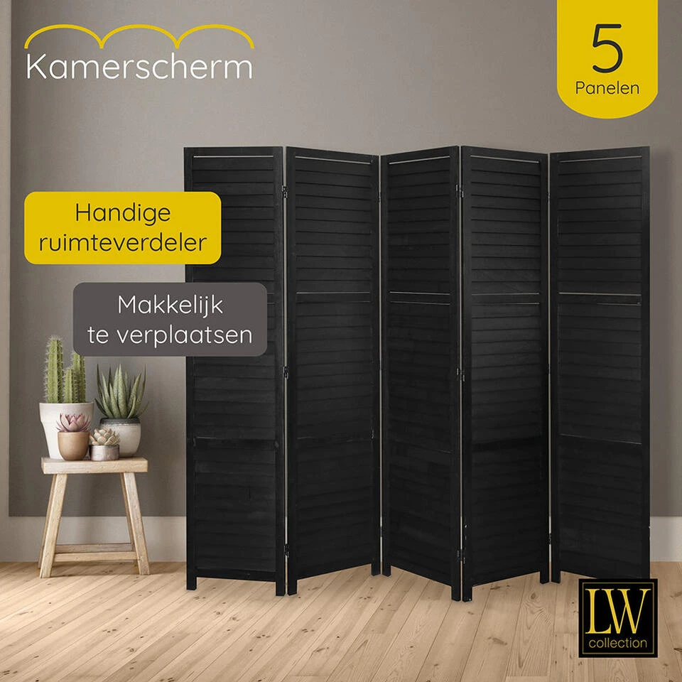 Dit decoratieve kamerscherm met 5 panelen van hout in de kleur zwart heeft een afmeting van 170×200 cm (LxB) en past goed bij ieder interieur in huis of op uw werkplek.