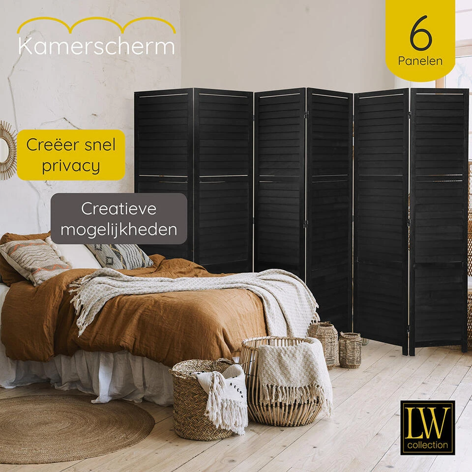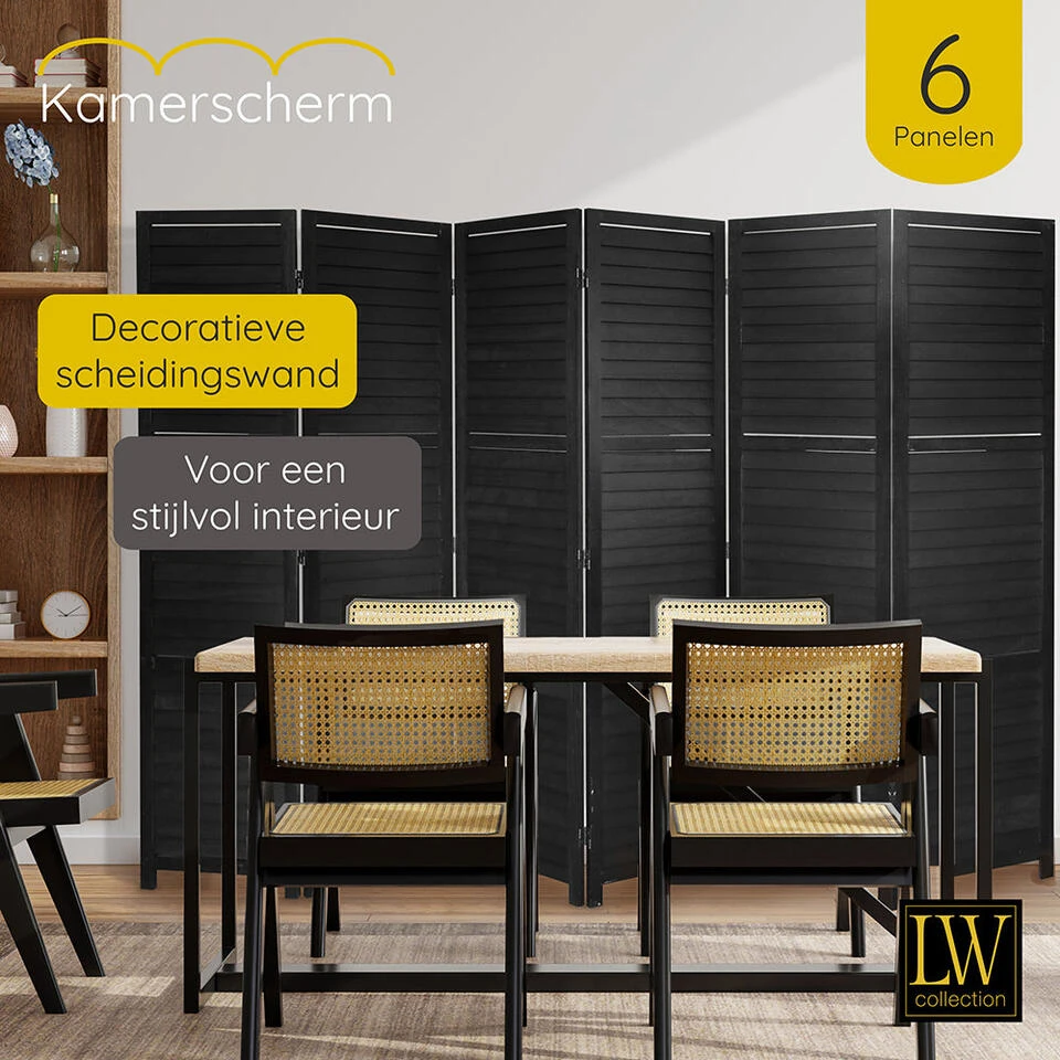 Dit decoratieve kamerscherm met 6 panelen van hout in de kleur zwart heeft een afmeting van 170×240 cm en past goed bij ieder interieur in huis of op uw werkplek. Â