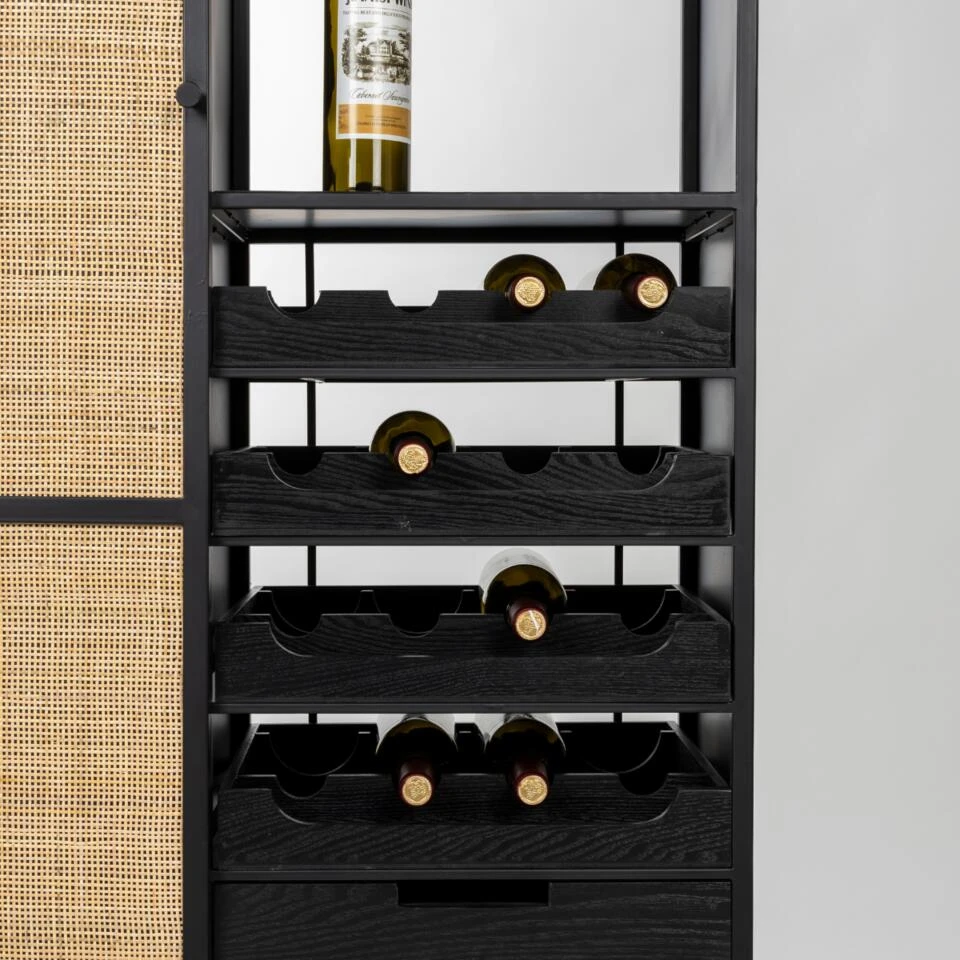 Deze wijnkast is afkomstig uit de Bjerka collectie van het woonmerk Puur. De kast heeft een gelakte afwerking van MDF hout met natuurlijke rotan webbing deur. Deze combinatie zorgt voor een natuurlijke maar strakke uitstraling. De pootjes zijn gepoedercoate ijzer. De kast biedt veel opbergruimte op verschillende manieren. Zo is de kast voorzien van 1 grote deur met drie legplanken en biedt hij ruimte voor 16 wijnflessen. Bekijk de andere kasten uit de Bjerka collectie voor eenheid binnen het interieur.