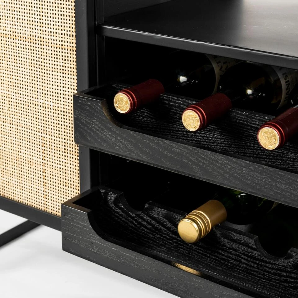 Deze wijnkast is afkomstig uit de Bjerka collectie van het woonmerk Puur. De kast heeft een gelakte afwerking van MDF-hout met natuurlijke rotan webbing deur. Deze combinatie zorgt voor een natuurlijke maar strakke uitstraling. De pootjes zijn gepoedercoate ijzer. De kast biedt veel opbergruimte op verschillende manieren. Zo is de kast voorzien van 1 grote deur met twee legplanken en biedt hij ruimte voor diverse glazen en flessen. Bekijk de andere kasten uit de Bjerka collectie voor eenheid binnen het interieur.
