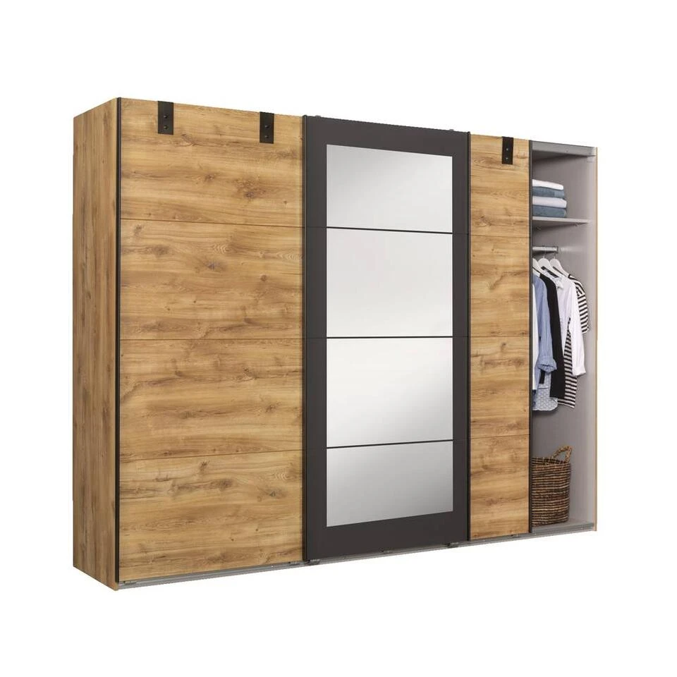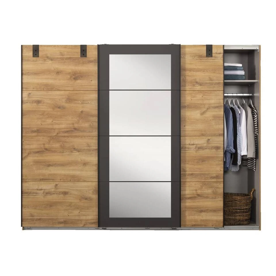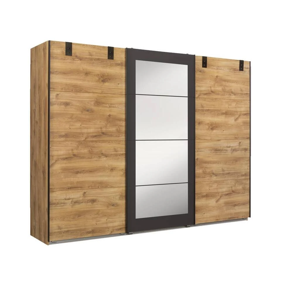 Schuifdeurkast Dex XL is een prachtige, grote linnenkast, gemaakt van spaanplaat. Deze spiegelkast is uitgevoerd in eikenkleur/grafiet en heeft drie schuifdeuren en een grote spiegel. Deze kledingkast heeft veel opbergruimte en wordt geleverd met 3 legplanken en roedes. Hij is niet alleen super handig, maar ook nog eens een echte eyecatcher voor elke slaapkamer of walk-in closet van een fashionista. De kast heeft een totale afmeting van 210x270x65 cm.