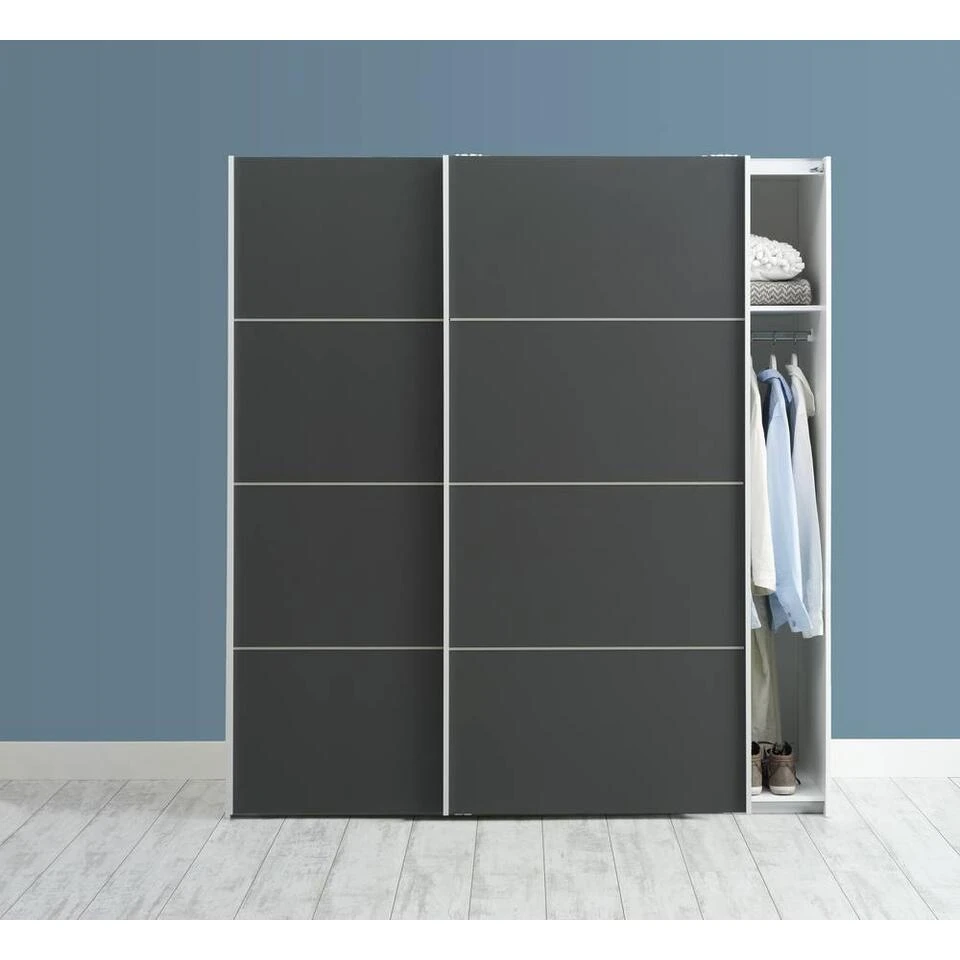 Schuifdeurkast Verona is zowel stijlvol als praktisch. Deze linnenkast biedt je genoeg ruimte om je kleding netjes op te kunnen bergen. De kledingkast wordt standaard geleverd met 2 roedes en 2 legplanken. De antraciete kleur combineer je eenvoudig met andere kleuren, hierdoor past de kledingkast vrijwel in ieder interieur. Deze kast heeft een afmeting van 200x182x64 (hxbxd).