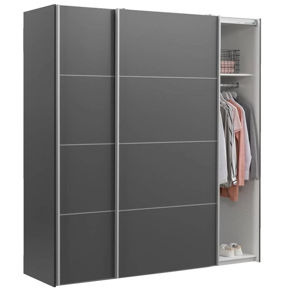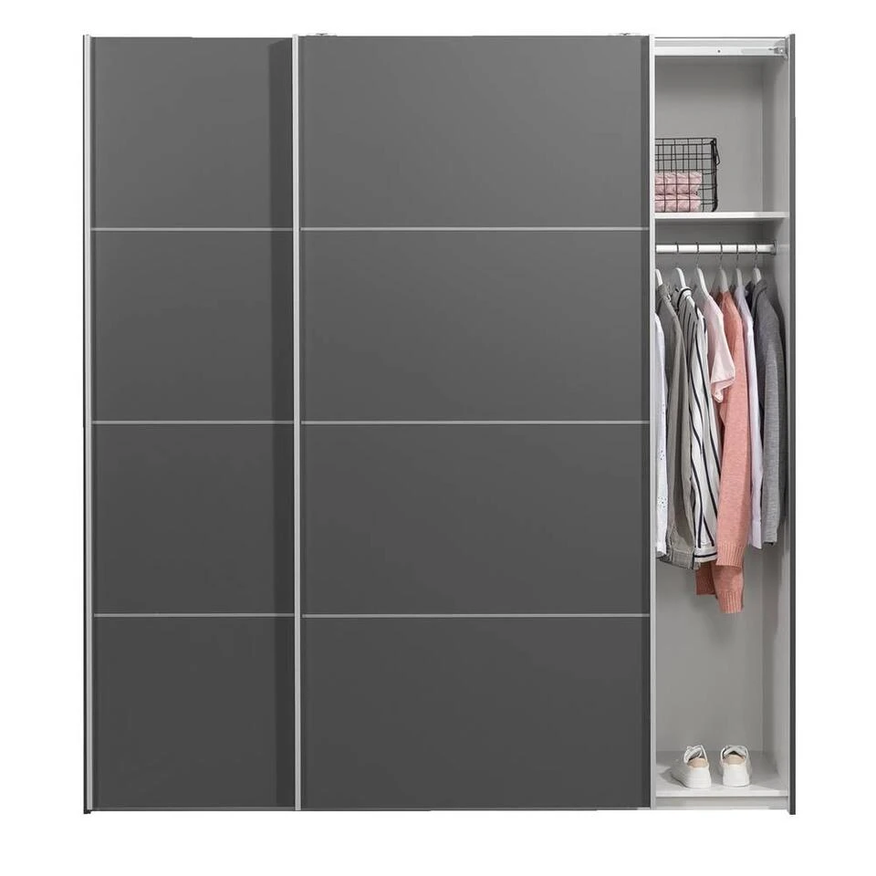 Schuifdeurkast Verona geeft je slaapkamerinterieur een modern accent. De kledingkast biedt voldoende ruimte voor al je kleding, schoenen en accessoires. De Verona kledingkasten zijn eenvoudig uit te breiden met extra accessoires en verkrijgbaar in diverse kleuren. De Verona is een eyecatcher in jouw nieuwe slaapkamer! Deze kast heeft een afmeting van 200x182x64 (hxbxd).