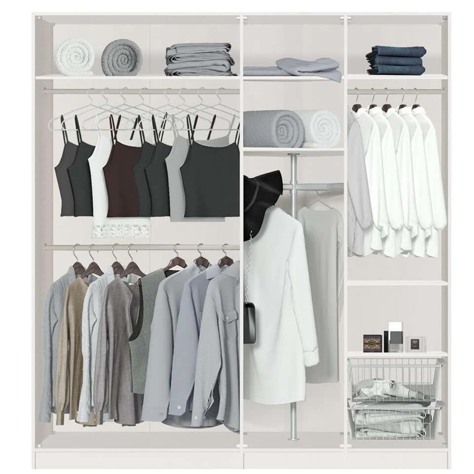 Hoekkast STOCK bestaat uit een kastombouw, draadmanden, kledingroedes en legplanken. De kast is dus heel compleet. De volgende inbouwelementen worden meegeleverd: