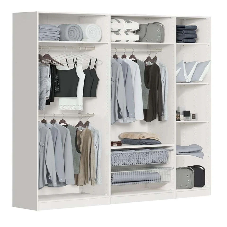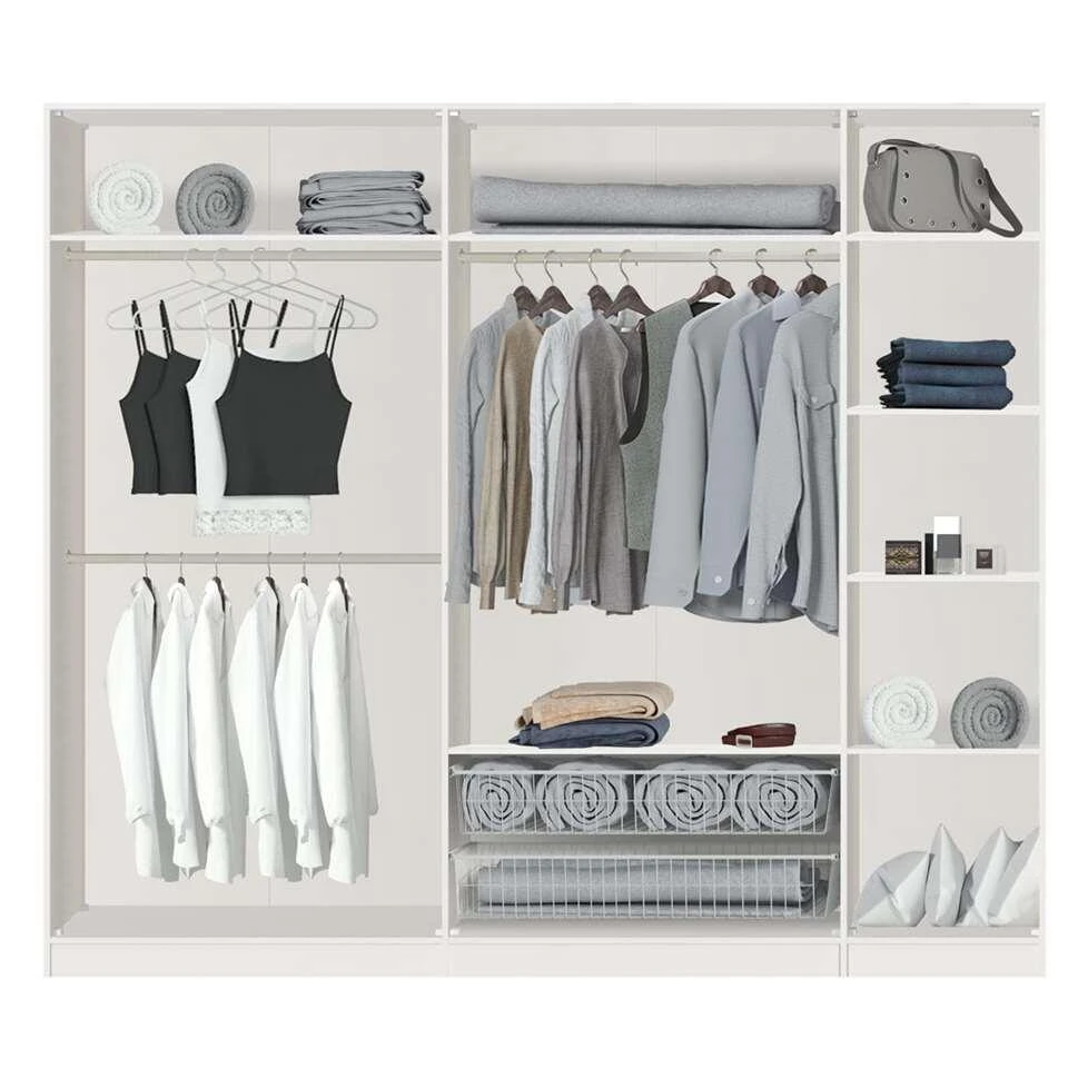 Kledingkast STOCK open is wit en heeft een totale afmeting van 195×252,2×56,5 centimeter. De kledingkast bestaat uit een kastombouw en verschillende inbouwelementen: