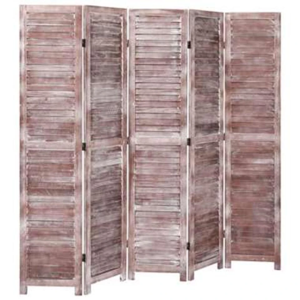 Deze vrijstaande en elegante ruimteverdeler met 5 panelen kan worden gebruikt als decoratie of als scheidingswand. Hij is perfect om in de slaapkamer te plaatsen om zo een aparte, eigen kleedruimte te creëren of om een deel van de kamer af te scheiden. Bovendien heeft de scheidingswand een stevig frame van paulowniahout en is hij ontworpen met openingen voor lichtinval en luchtcirculatie. Wanneer het kamerscherm niet gebruikt wordt, kan het gemakkelijk worden ingeklapt om ruimte te besparen. Het vouwscherm is eenvoudig te monteren.