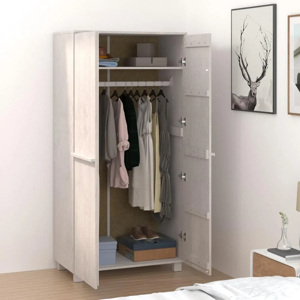 De kast is gemaakt van massief grenenhout waardoor hij stabiel en stevig is. De kledingkast heeft een klein bovenvak en een groot ondervak met ophangstang. Hierdoor biedt de kast voldoende ruimte om je langere outfits en accessoires netjes op te bergen.