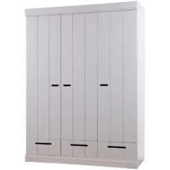 Uit de serie CONNECT, een fabricaat van het Nederlandse merk WOOOD, is deze stoere basic 3-deurs kast met 3 handige lades (voorzien van stevige, metalen ladegeleiders). Met de CONNECT kasten kun je je eigen kastenwand bouwen! De romp van de CONNECT kast is gemaakt van massief grenenhout [FSC-gecertificeerd]. De binnenzijde is voorzien van een gemelamineerde legplanken, wat erg praktisch is met schoonmaken! De breedte van de legplank rechts is 447 mm. Van onder naar boven is de tussenruimte tussen de planken 373, 405, 341 en 374 mm, dit zijn vaste maten en dus niet verstelbaar.