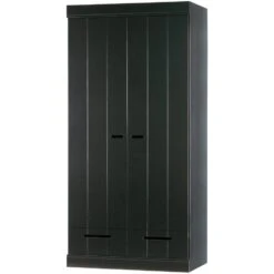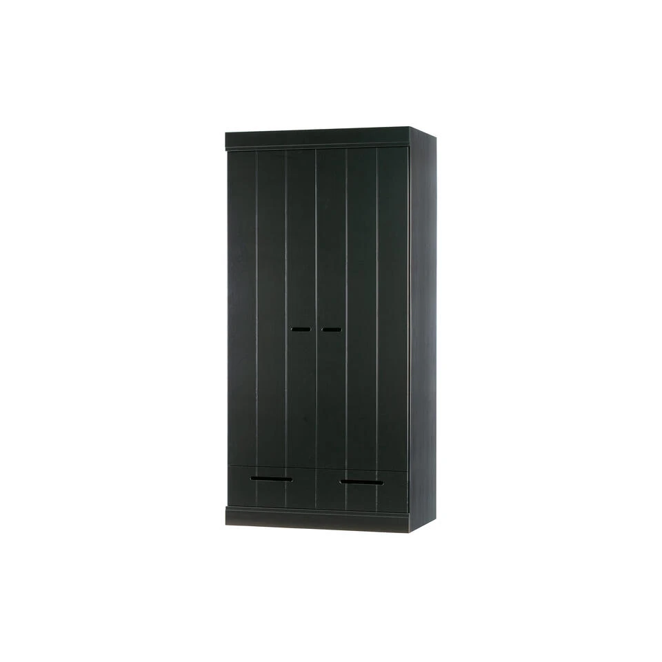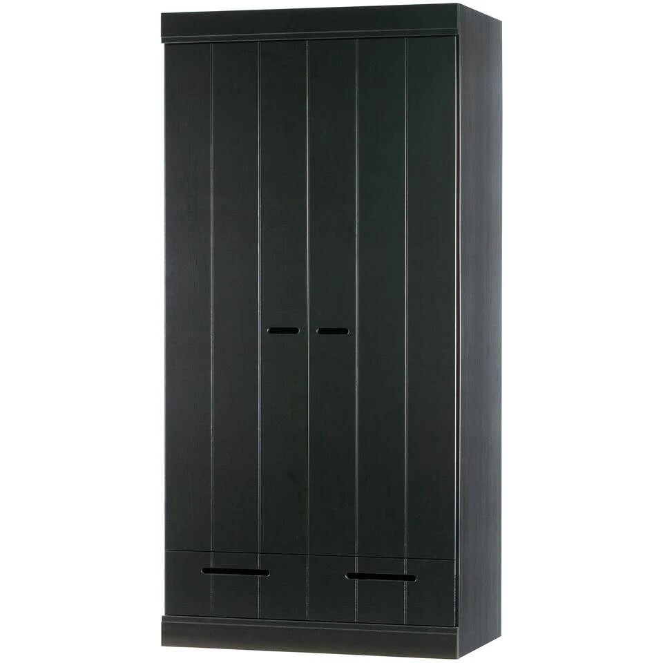Een ruime, stoere kast dat is deze Connect 2-deurs kast met lade en strokendeur met sleufgreep uit de collectie van het Nederlandse merk WOOOD. De romp van de Connect 2-deurs kast is gemaakt van massief, FSC gecertificeerd, grenenhout met een zwarte afwerking. De binnenzijde is voorzien van gelamineerde legplanken, praktisch met schoonmaken. De Connect 2-drs kast wordt standaard geleverd met hanggedeelte en 1 legplank over de gehele breedte van de kast. Tip: Maak je van deze kast toch liever een complete legkast? Dan is er een extra interieurpakket beschikbaar, bestaande uit een extra tussenschot met 2 extra legplanken en een korte roede.