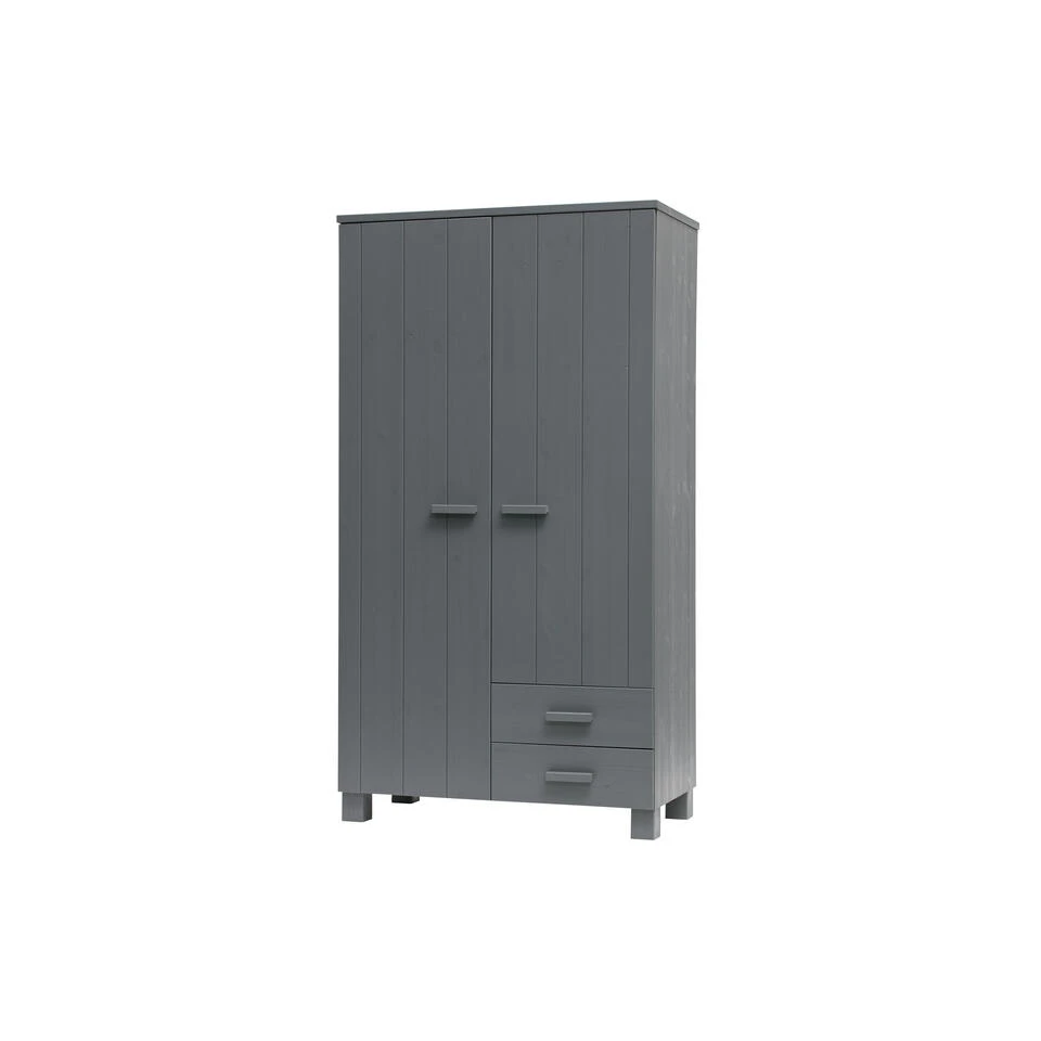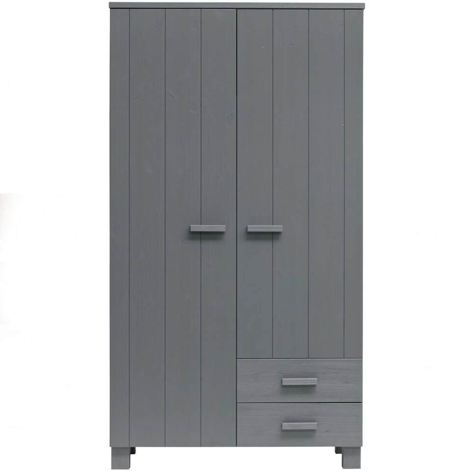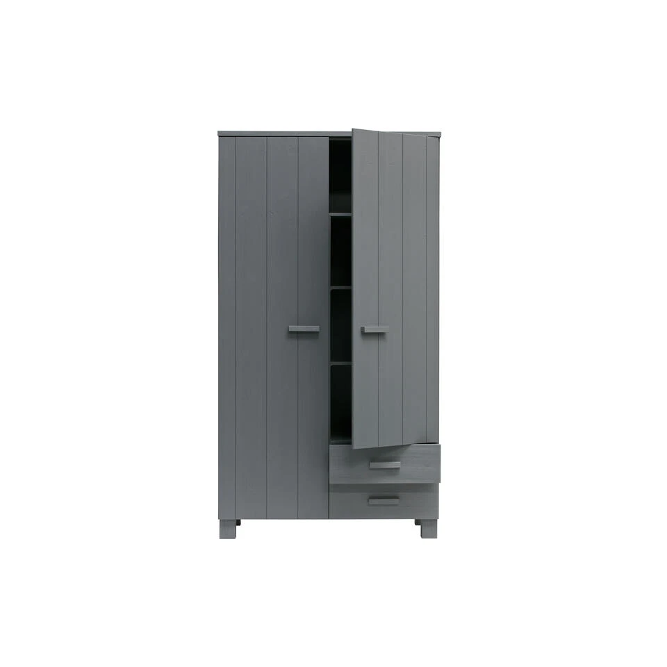 WOOOD Dennis kast met laden 202x111x55 (hxbxd) is een stevige, stoere en praktische kast uit de collectie van het Nederlandse merk WOOOD. De Dennis kast is gemaakt van, FSC gecertificeerd, grenenhout met een staal grijze finish en heeft een geborstelde afwerking. De deuren hebben een verticale v-groef belijning met bruin leren greep. Het interieur van de Dennis kast is van melamine en bestaat uit één brede legplank bovenin met daaronder aan de linker kant een roede en aan de rechter kant drie legplanken en een ladeblok met 2 lades. Artikelkenmerken